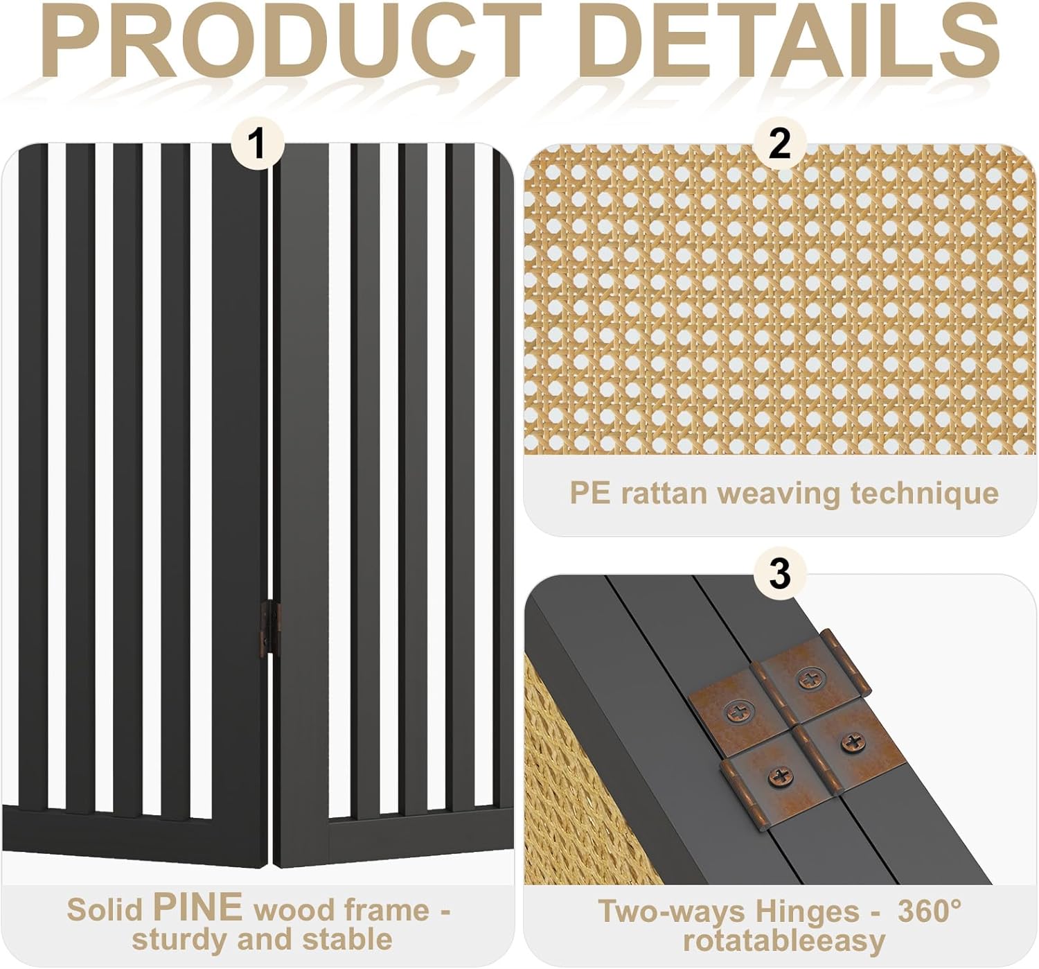 3-Panel Hand-Woven Rattan Room Divider, Tall Foldable Privacy Screen with Wooden Frame - Freestanding Portable Partition for Home Office, Bedroom, Bathroom(Black-Pine)