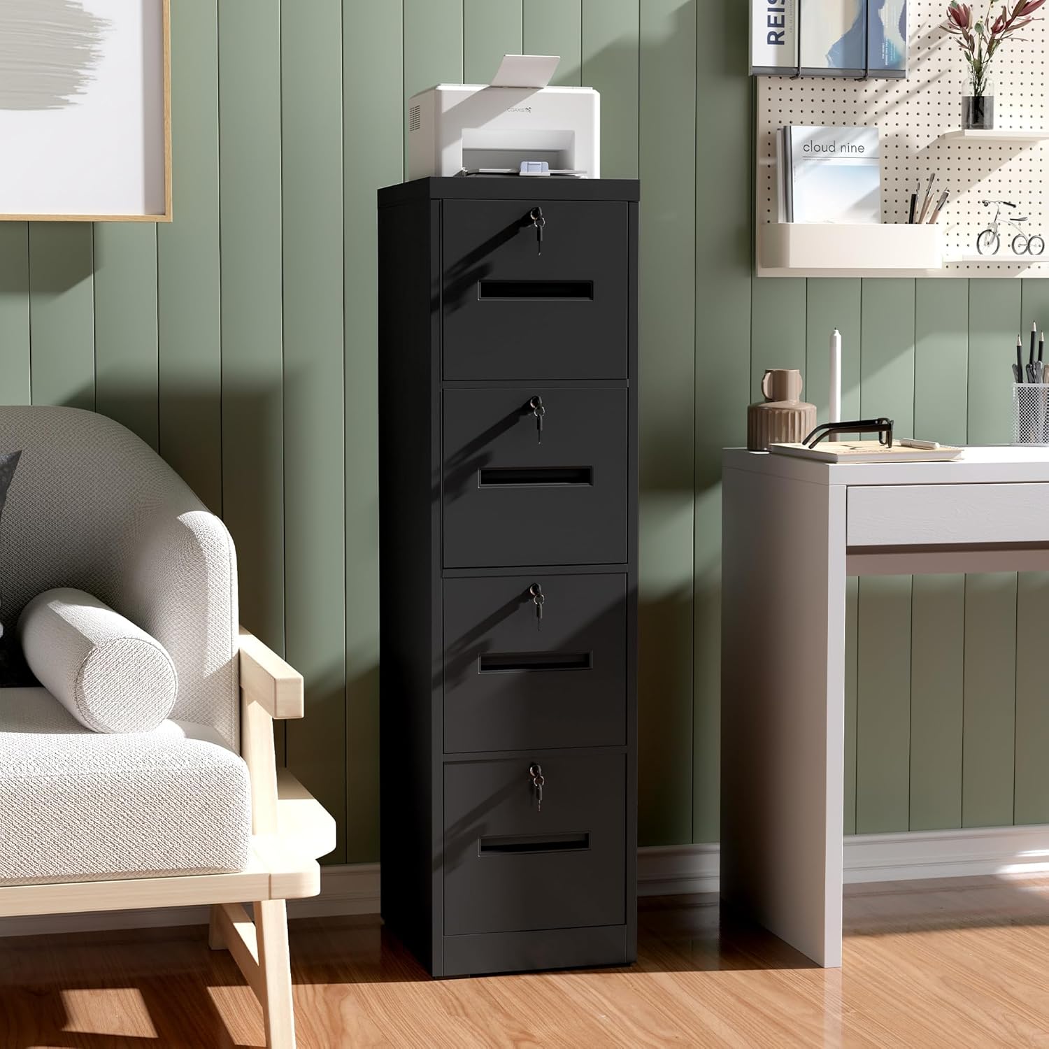 - ăLocking Filing CabinetăThis file cabinet 4 drawer with a lock fits most desks. Each drawer comes with its own lock to protect your documents, adding an extra layer of security for your home or office. Every drawer features a labeled slot for easy identification and organized storage.