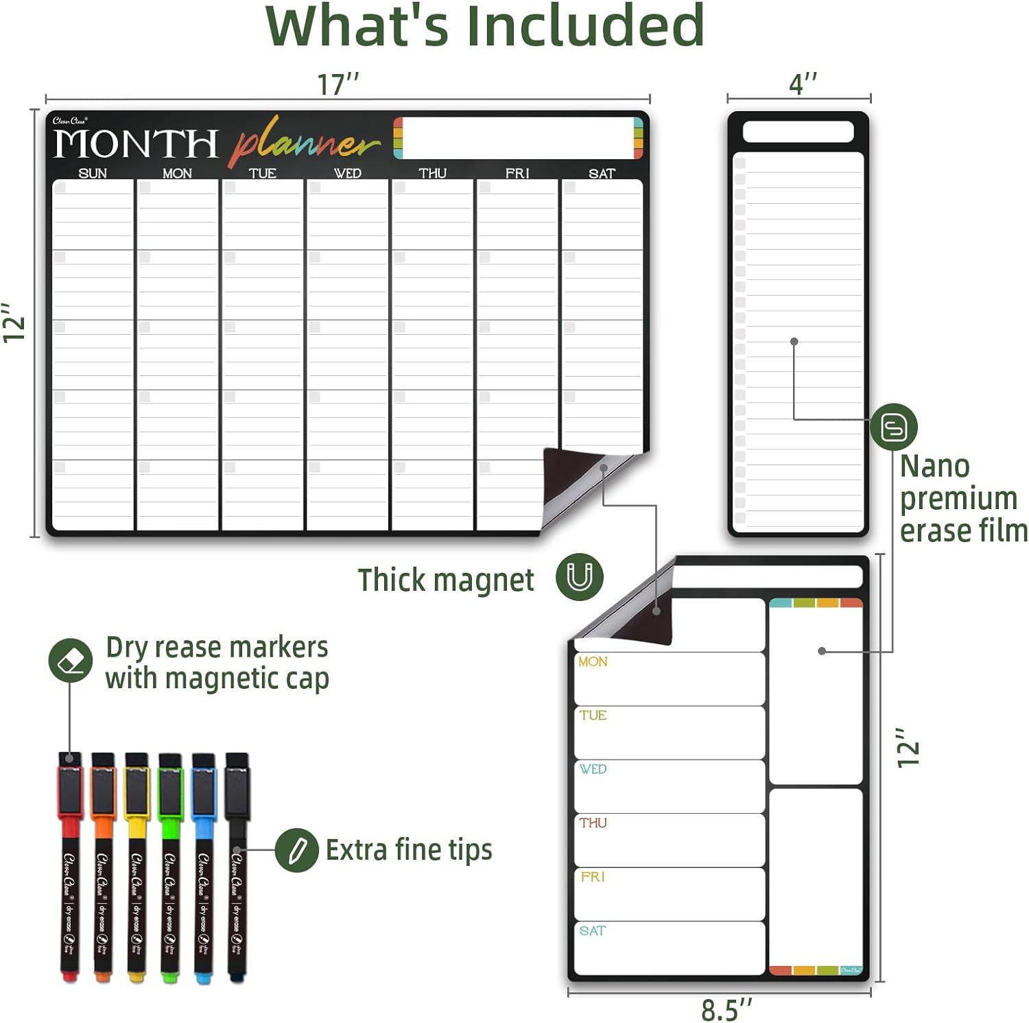 Magnetic Dry Erase Monthly Calendar Set - 17"x12" Monthly and 8.5"x12" Weekly Calendar, 4"x12" List Board for Fridge - 6 Extra Fine Point Dry Erase Markers Included - Shipped Flat