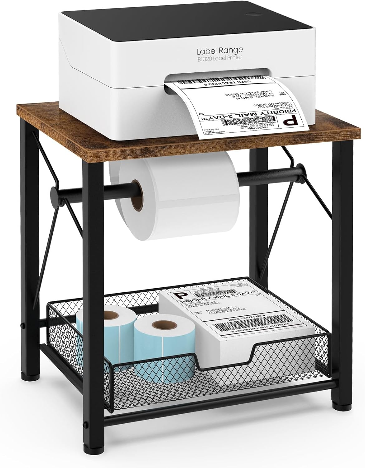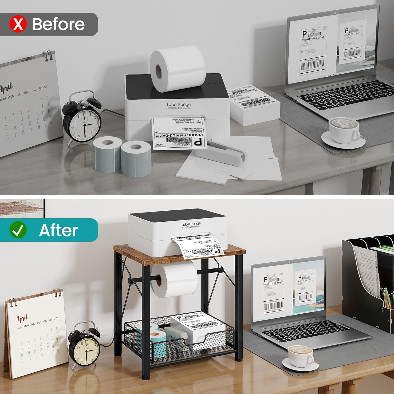 - 【All-in-One Label Holder with Drawer】 This label holder is designed to efficiently store both printers and labels, maximizing workspace organization. The top layer holds the printer, while the lower section features a wooden pole for label rolls and a bottom drawer for extra office supplies. A perfect space-saving solution for an organized and clutter-free desk.