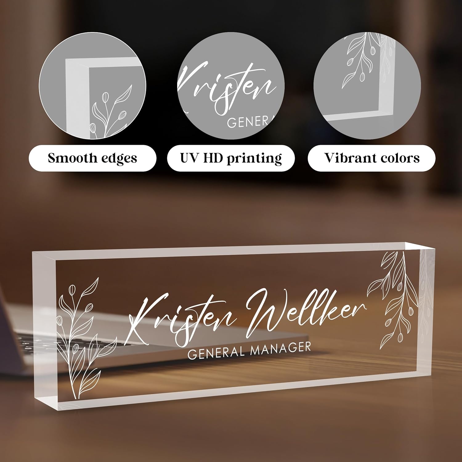 - 🍀 High Quality Acrylic - The name plate is made of high-quality transparent crystal acrylic blocks and printed on the back of the name plate using UV HD printing technology. The text and beautiful floral patterns present a 3D stereoscopic effect. The color is bright and will not fade, and can be used for a long time.