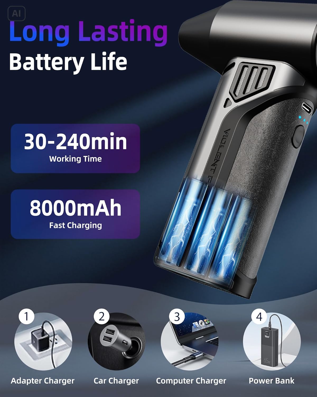 - [8000mAh Battery & Rapid Charging]: Enjoy 200+ minutes of runtime with the cordless air duster’s massive battery. A 10W Type-C port fully charges it in 3 hours. Built-in overheat protection halts operation at 150°C, making this electronic air duster both reliable and safe for extended use.