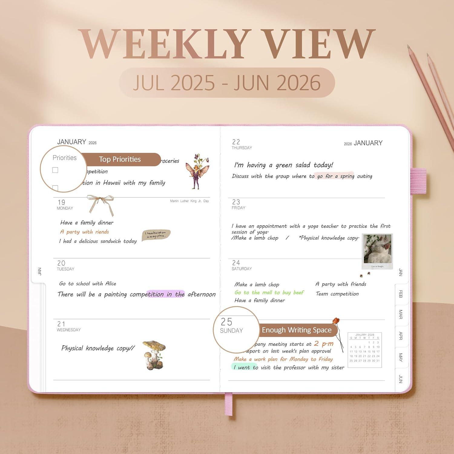 - 2025-2026 planner: Simplify your schedule with the 2025-2026 A5 Weekly & Monthly Planner! Featuring 12 months (Jul 2025-Jun 2026) of clean, intuitive layouts, it’s ideal for task management, goal tracking, and time optimization. Students will love the assignment sections, while professionals can streamline projects and meetings. The elegant design, spacious pages, and lay-flat binding make it a joy to use daily. Stay organized, reduce stress, and make every month count!