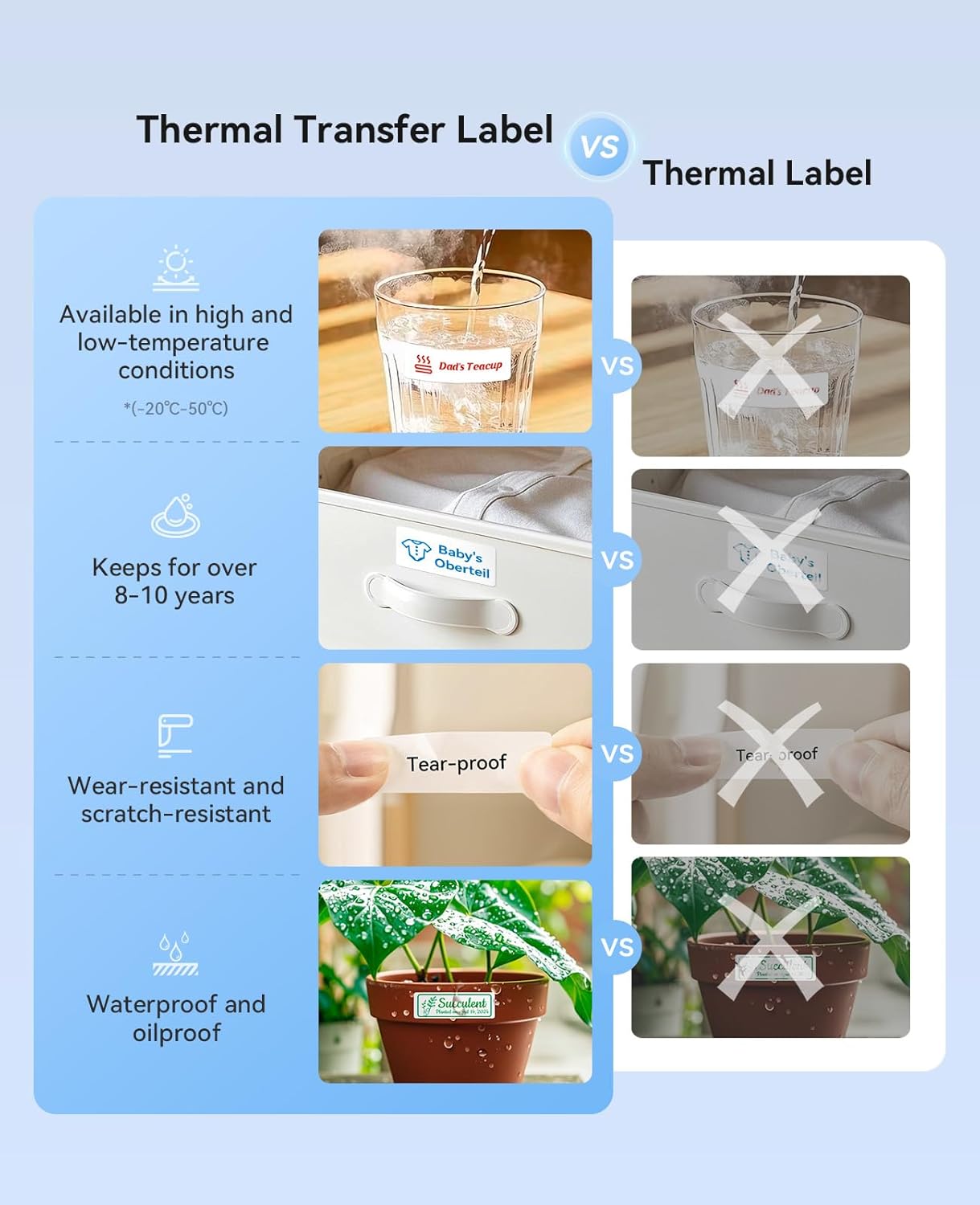 - High-quality Printing: The N1 label maker adopts thermal transfer technology with 203 DPI, compared to thermal print, the content printed on thermal transfer labels is more clear and keep for a long time, wear-resistant and scratch-resistant, waterproof, and resistant to high and low temperatures. Addresses the limitation of short storage time of thermal labels. Long-lasting and high-quality labels bring a satisfying experience