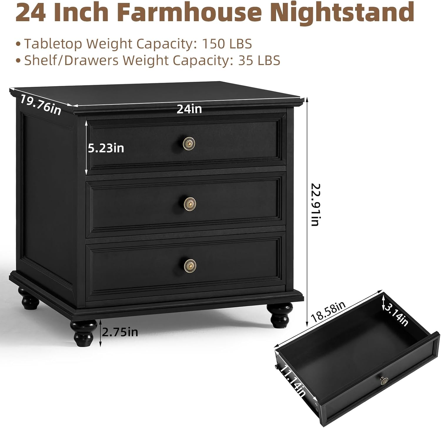 24" Wide Farmhouse Night Stand,Large End Table with 3 Drawers & Metal Handle,Black Wood Dresser for Bedroom Cabinet, Bed Side Tabl·e Chest of Drawers,Nightstand for Living Room,Close