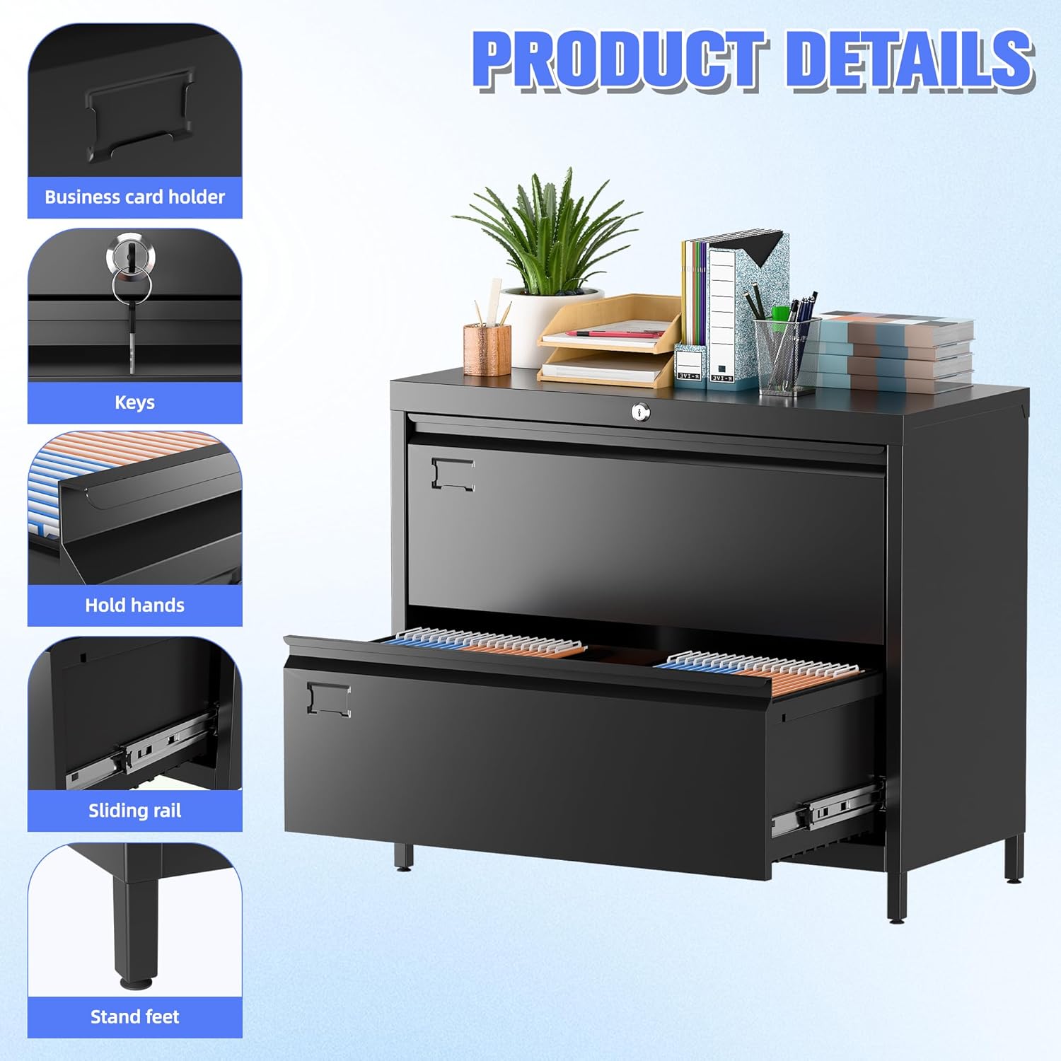 Metal 2 Drawer Lateral File Cabinet with Lock & Adjustable Feet - Wide Filing Cabinet for Letter/Legal/F4/A4 Hanging Files - Includes Business Card Holder,Home Office School Storage,Black