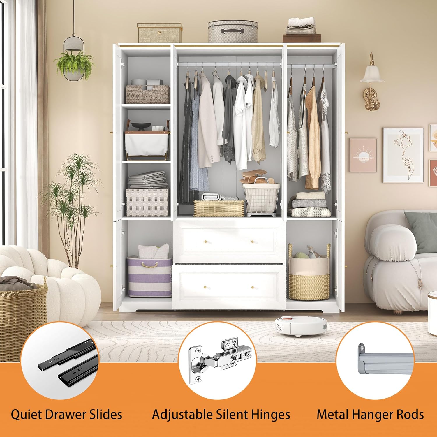 - High-Quality Material: The armoire with shelves and drawers is made from engineered wood, offering stability and durability, with resistance to deformation. The surface of the armoires and wardrobes is treated with a wear-resistant veneer, effectively preventing scratches, water, and moisture, making daily maintenance easier. The wardrobe armoire closet with drawers is equipped with adjustable soft-close hinges, ensuring quieter operation and reducing daily noise for a more comfortable experience. The closet wardrobe with drawers features an anti-tip mechanism, securing it firmly against the wall for enhanced safety, making it especially suitable for homes with children or pets.