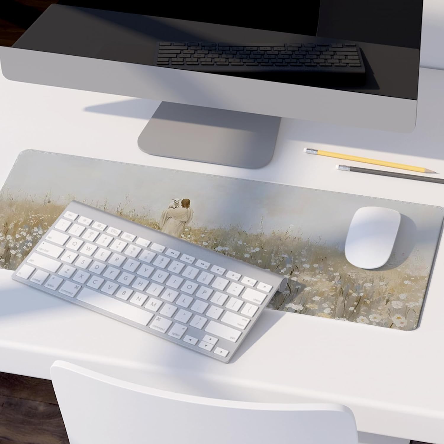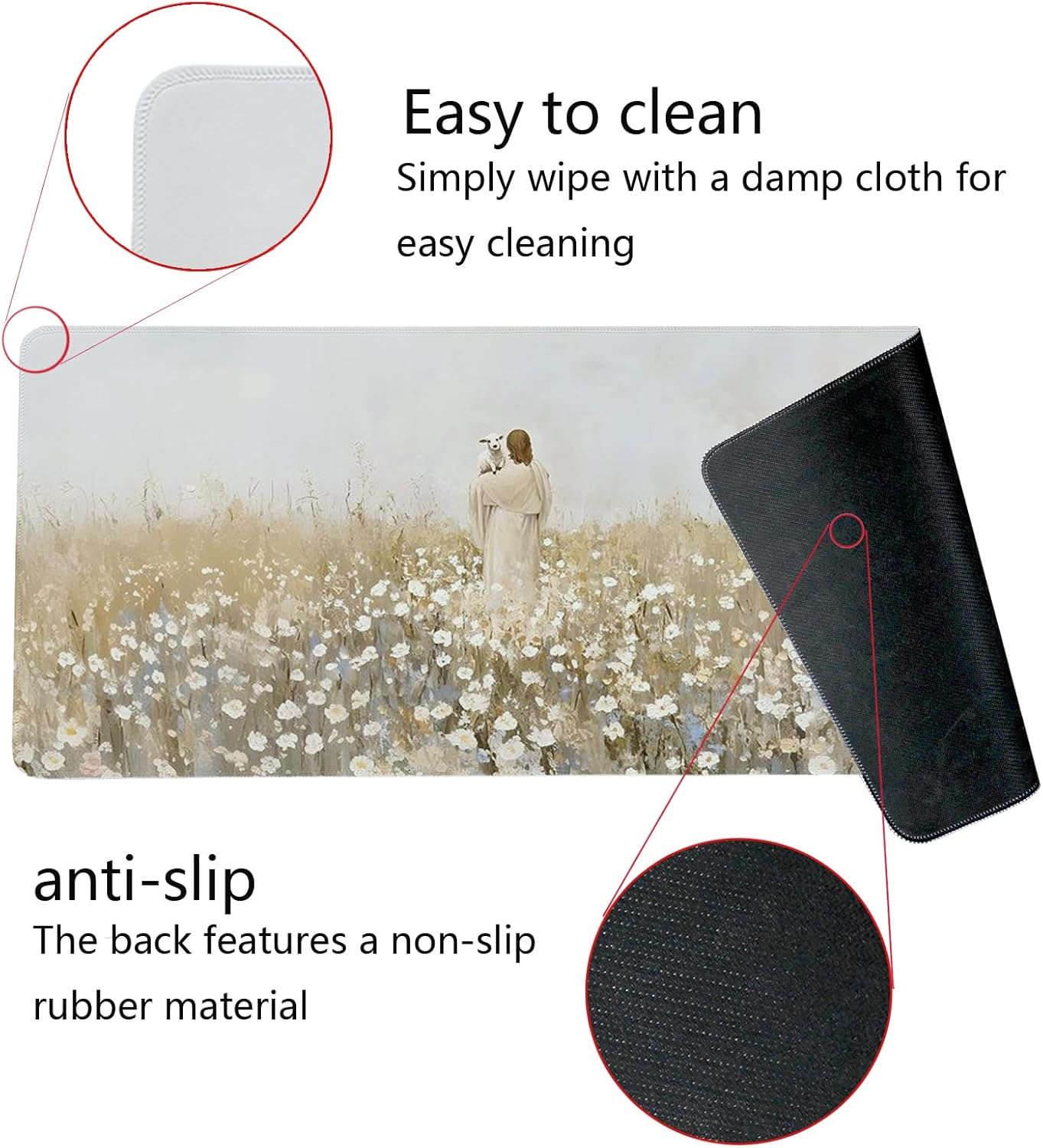 Christian Themed Mouse Pad,Jesus Religious Mouse Pad,Large Vintage Easter Decor Desk Mat,Jesus Find The Lost Lamb,White Floral Desk Mat,Religious Gifts Christian Gifts for Women,31.5x11.8