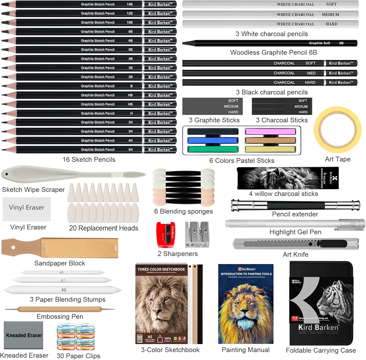 Kird Barken 112 PCS Professional Drawing Set – Sketch Kit with Graphite & Charcoal Pencils, 3-Color Sketchbook, Art Supplies for Shading & Blending – Ideal for Artists, Adults, Teens & Beginners