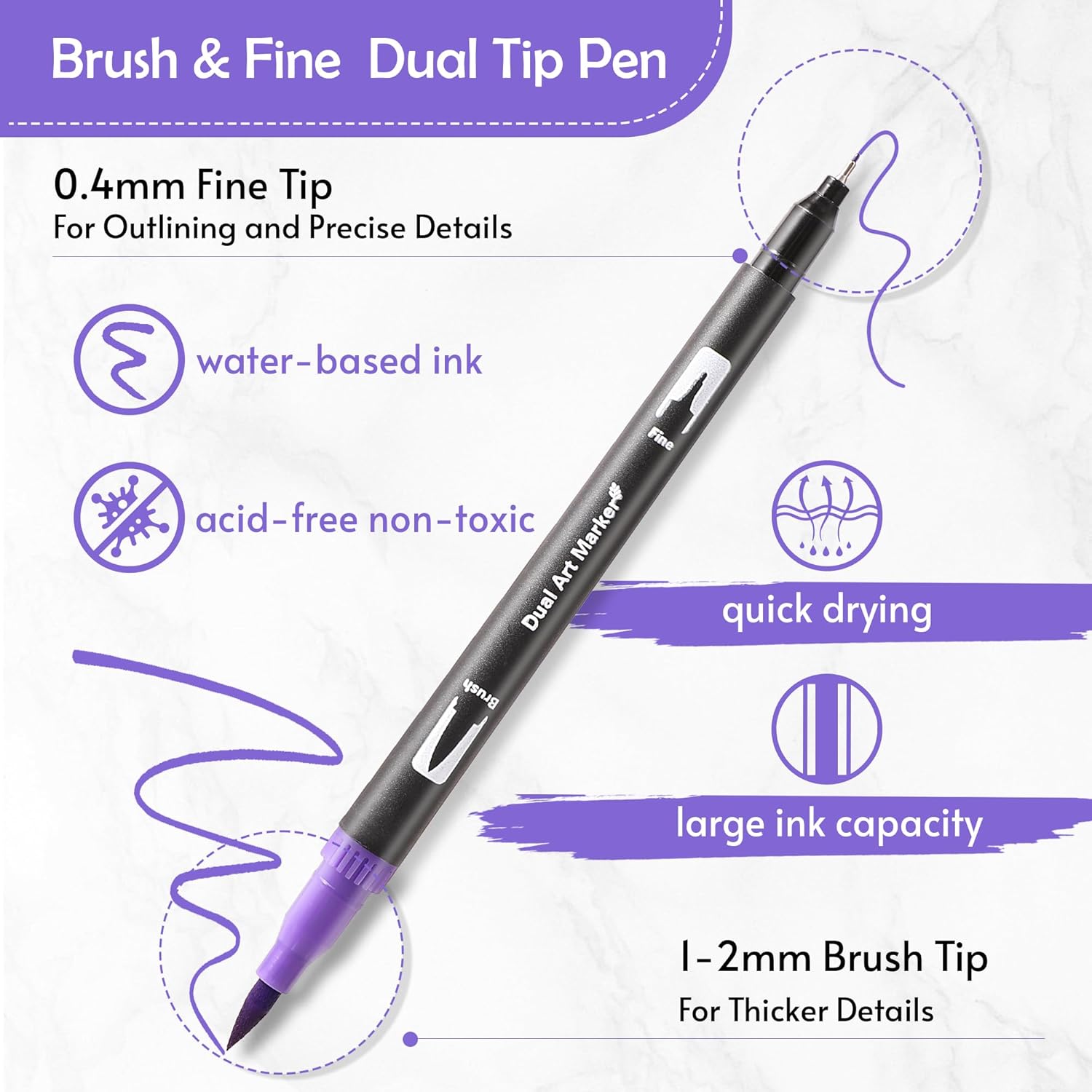 - 🎨 Convenient Dual Tip Paint Markers: Each watercolor marker features two different tips to meet different coloring needs, eliminating the hassle of switching nibs and offering greater convenience for your creations. The 0.4mm fine tip is perfect for sketching outlines and adding details, while the 1-2mm soft brush tip is ideal for shading and quickly coloring large areas in your art projects. Whether you're a beginner or a professional, you can fully unleash your creativity!