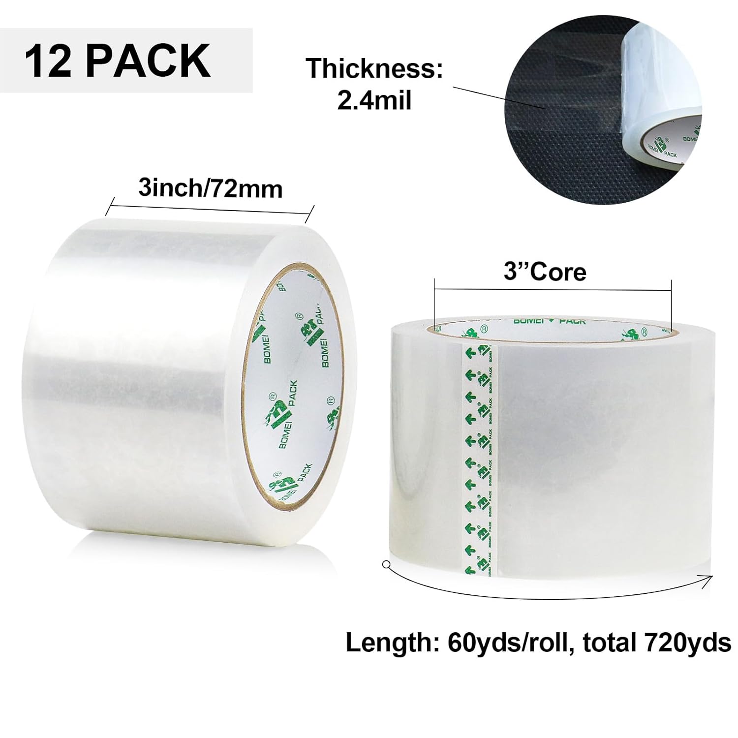 - ✔SPECIFICATION: Each clear tape rolls is 2.4mil in thickness, 3inch/72mm in width, and 60yds in length, total 12rolls 720yds. Standard 3inch core perfectly fit standard 3inch hand-held dispenser.