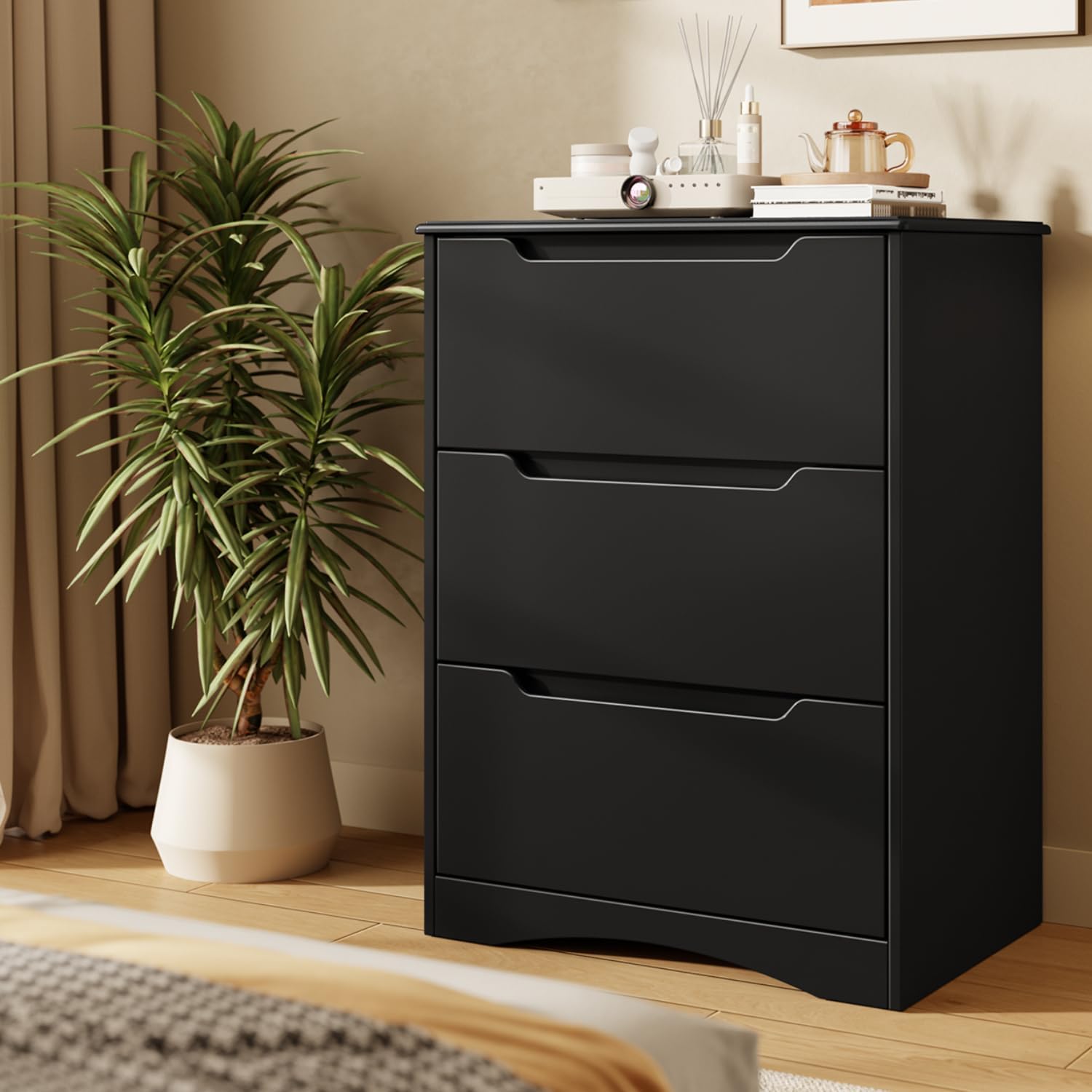 Gizoon 3 Drawer Chest, Chest of Drawers for Bedroom, Storage Organizer with Large Storage Space,Anti-Tip Device and Recessed Handles, Black