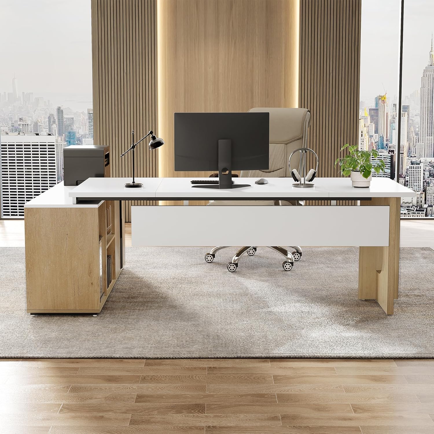 LITTLE TREE 74-Inch Executive L-Shaped Desk with Storage Cabinet & Shelves, Large Home Office Computer Desk, Modern Business Workstation for Professionals (Oak & White)