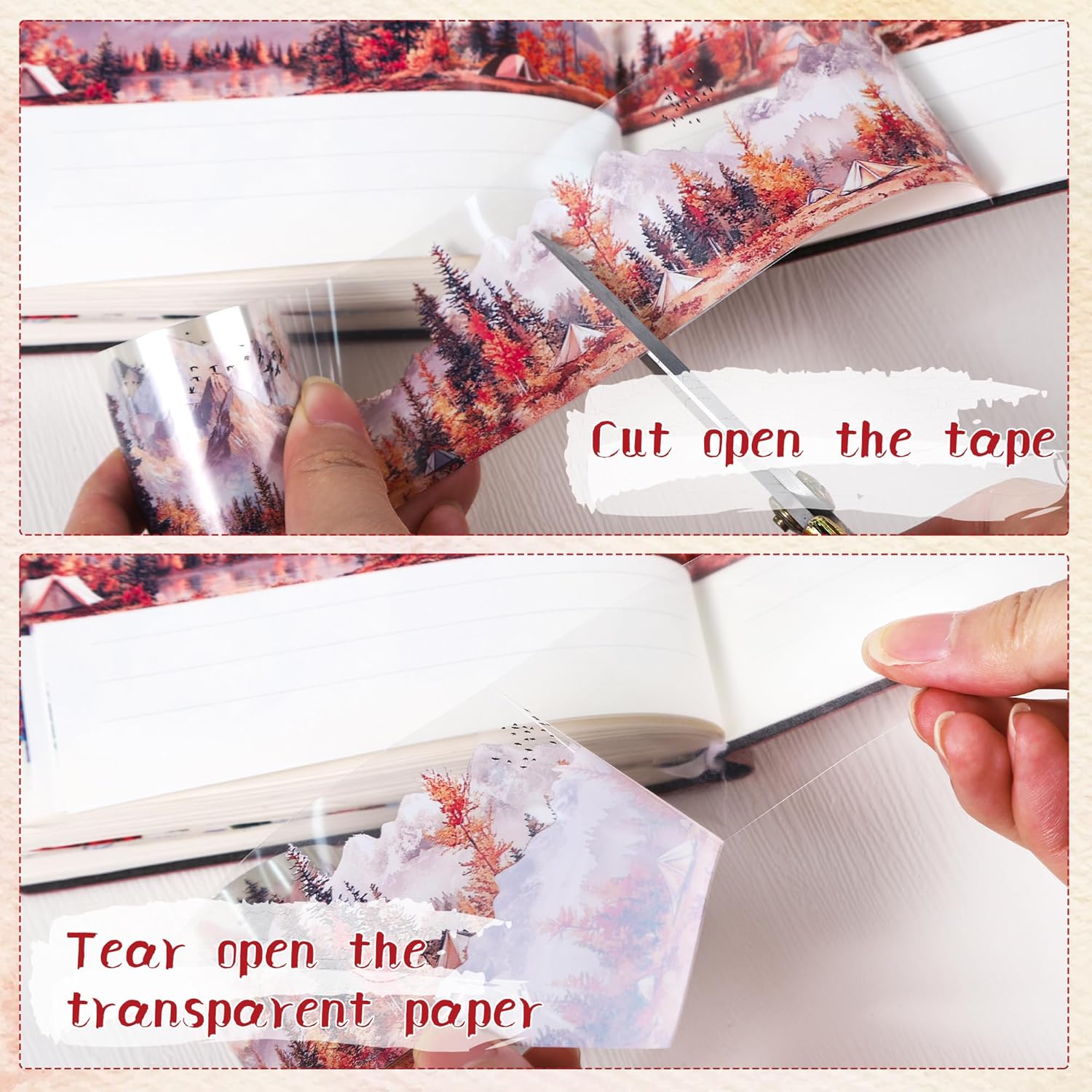 - Stunning Autumn Mountain Scenery Design: This PET tape features a breathtaking autumn scene with vibrant colors, majestic mountains, and serene camping settings, offering a picturesque backdrop for your creative projects