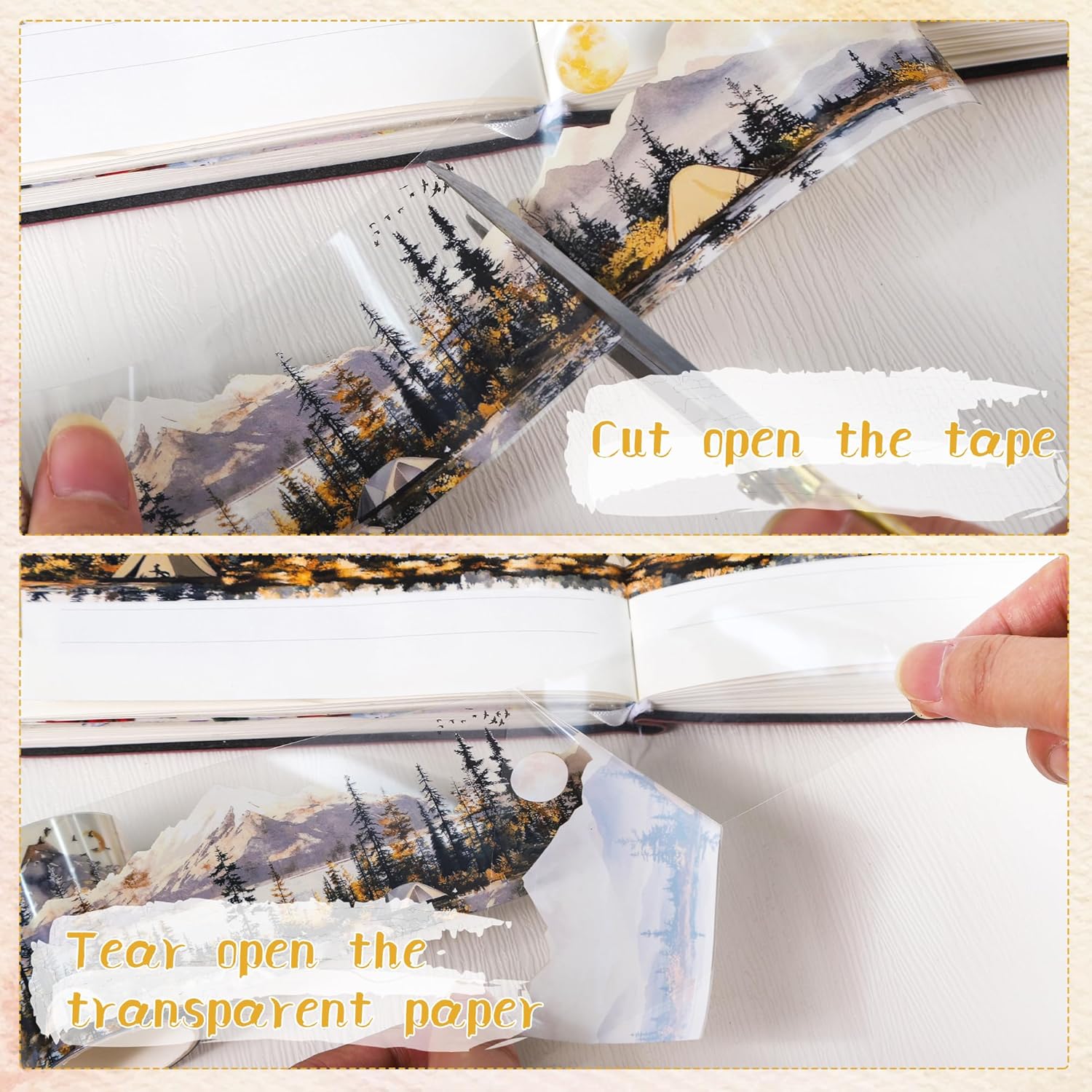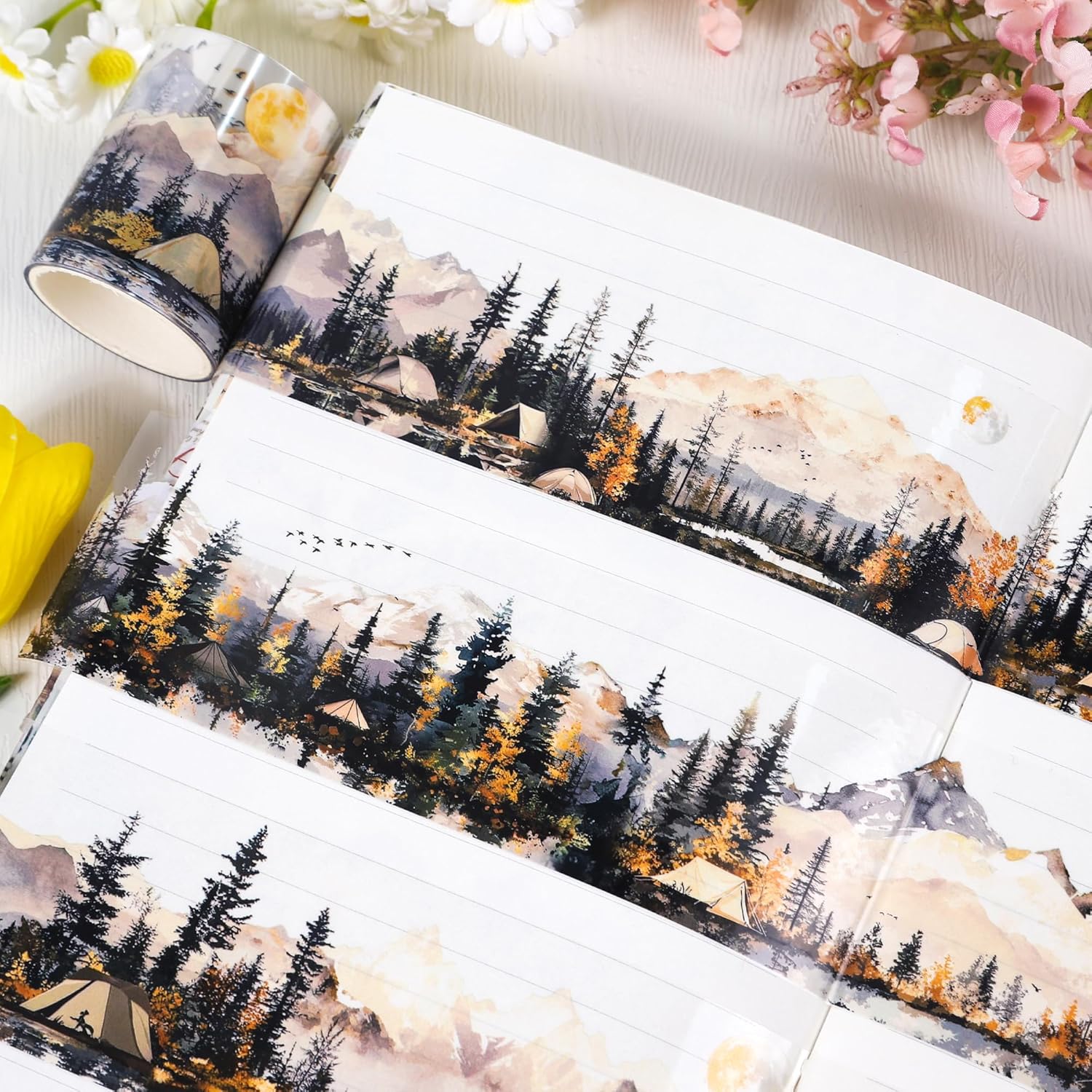 - Sunset Scenery Design: This PET tape features a beautiful illustration of serene mountains, peaceful forests, and camping scenes, evoking a sense of adventure and tranquility