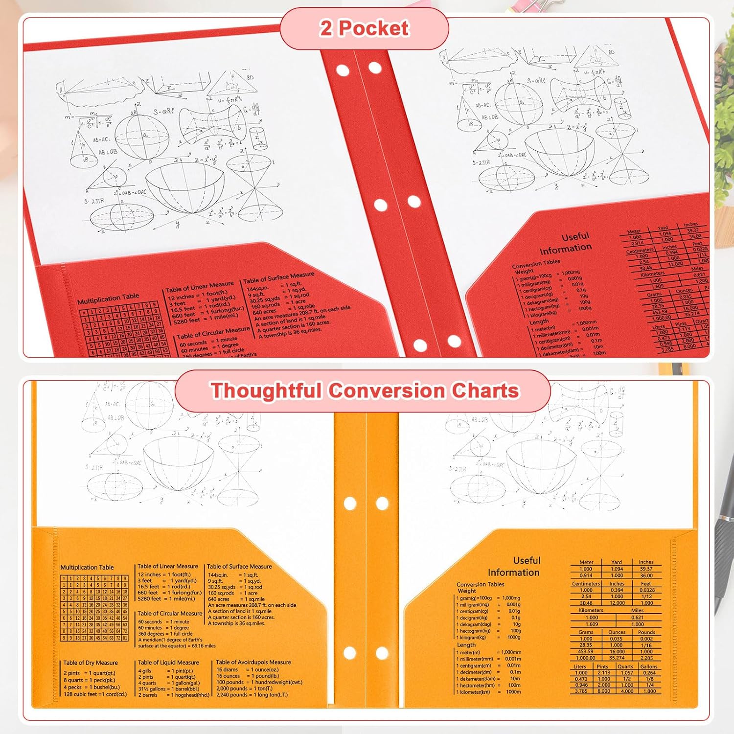 - Enough Quantity for Use and Replacement: you will receive 12 plastic pocket folders, each folder has 3 holes and 2 inside pockets, each folder pocket contains creative designed calculation conversion tables, help you quickly solve simple math problems; Can hold 3 binders and 8.5 X 11 inch letter-sized paper, each pocket can easily and neatly stack 50 pages of letter-sized paper