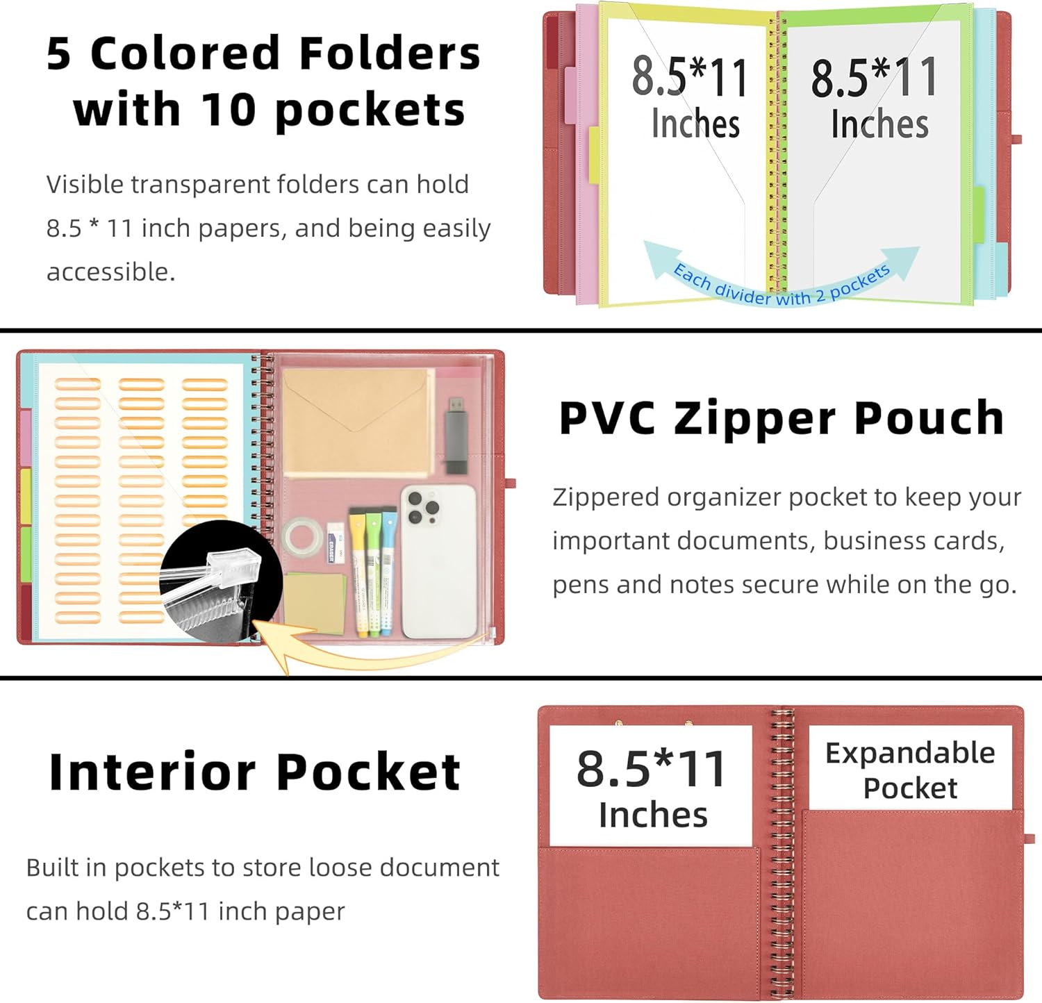 Ospelelf Red Foldable Spiral Clipboard Folio with Storage Zipper Pouch, 5 Plastic Folders with 10 Pockets, Refillable Lined Notepad (11" x 8.5"), Linen Hardcover Project Organizer