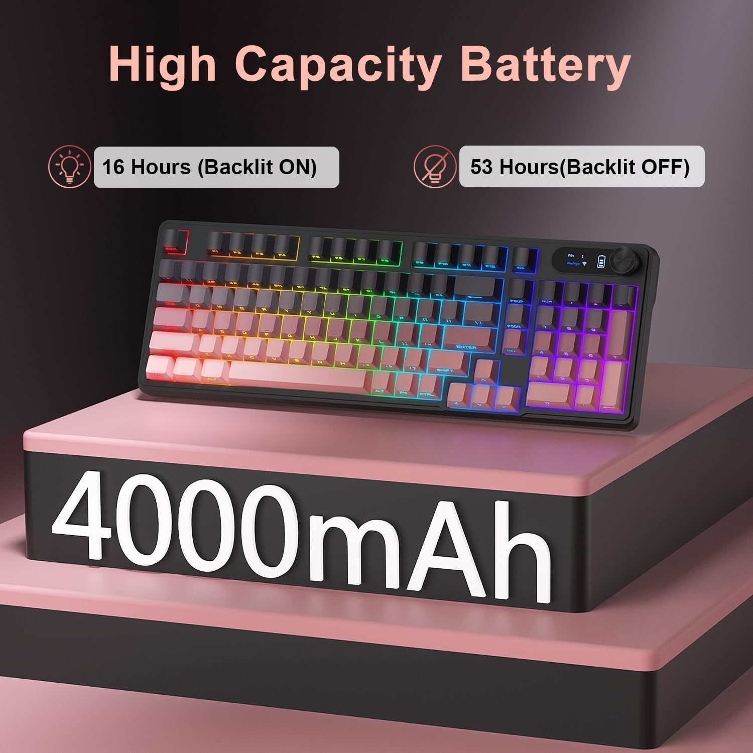 - ăSmart Screen & Control Knobă: The keyboard built-in digital display shows connection mode, battery level, and system status (WIN/MAC) at a glanceâno more guessing. Use the intuitive knob to easily adjust volume or backlight effects without breaking your focus, whether you're working, studying, or gaming.