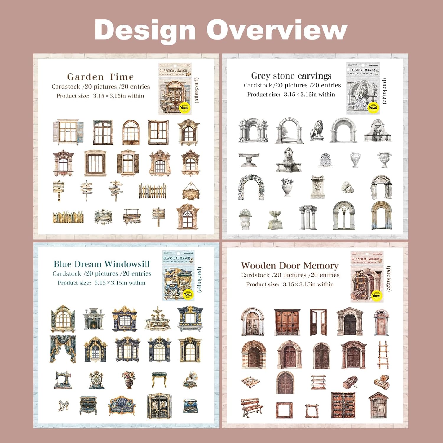 - Vintage Manor Theme: Features 4 unique styles with 20 designs each, totaling 80 pieces. Inspired by European classical architecture, these stickers bring a timeless charm and layered texture to your scrapbook and journal pages