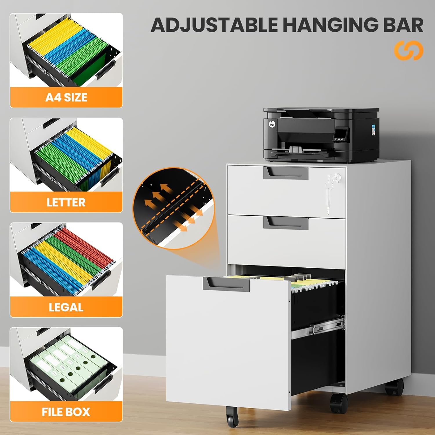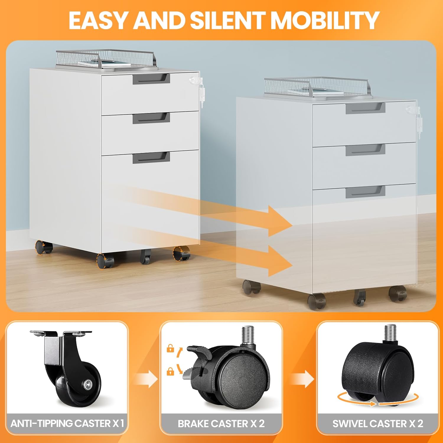 - ăSTURDY STEEL FRAMEăâ¶â¶We've used solid steel to engineer our 3-drawer mobile file cabinet. It is durable, resistant to dents and warping, and powder-coated with a finish that prevents scratches and rust. High-quality materials ensure the filing cabinet has sufficient strength and stability, which is suitable for use in multiple scenarios.