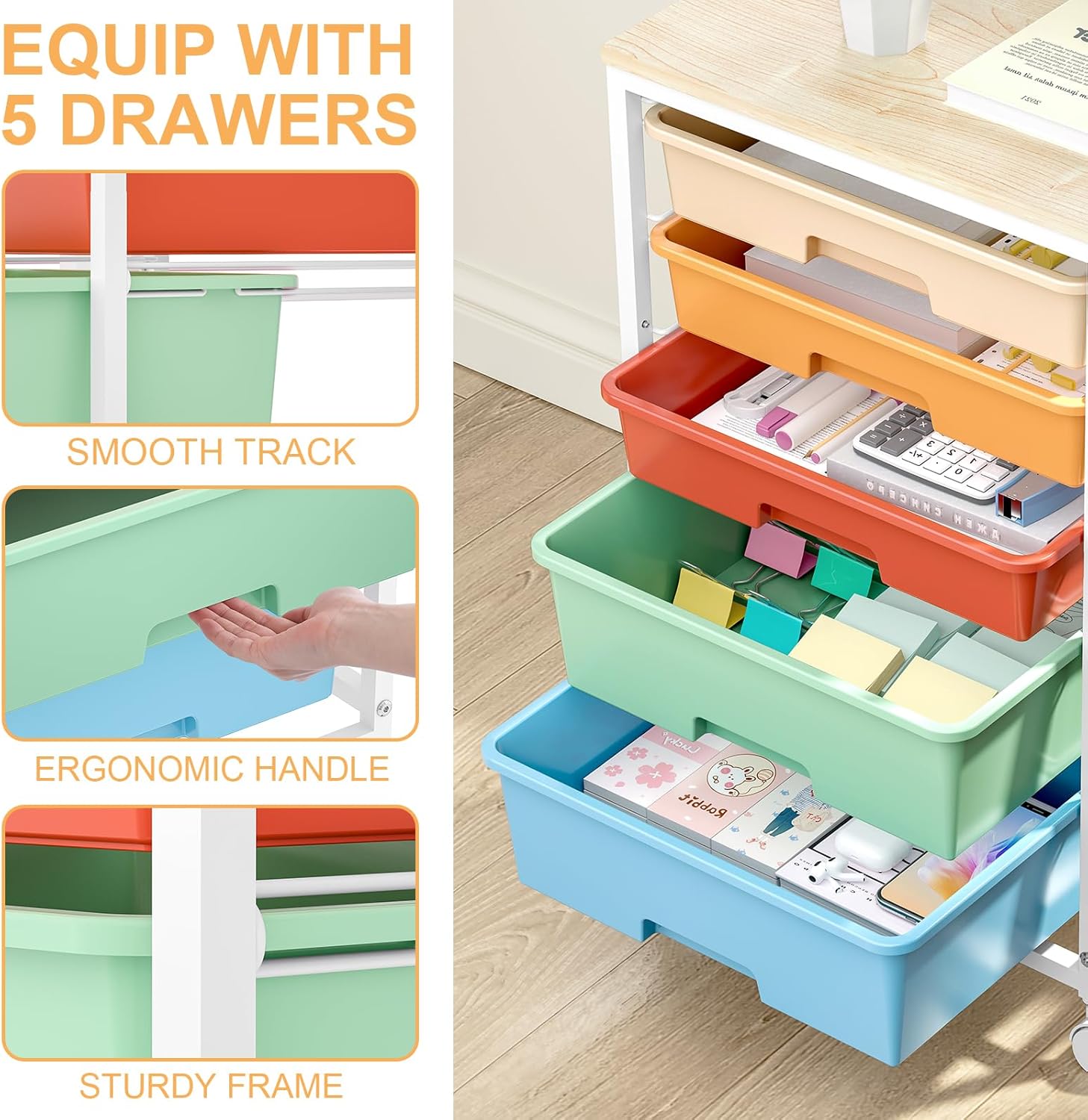 - 5 DRAWER FOR LARGE STORAGE CAPACITY: Rolling cart with drawers includes 2 big drawers and 3 small drawers which provide ample space for you to store stuff by different categories. Moreover, you can organize these items by color, stereotype, and size to keep them tidy and clean.Slide-out drawer design, with smooth slide track and ergonomic handles, easy to open or close.