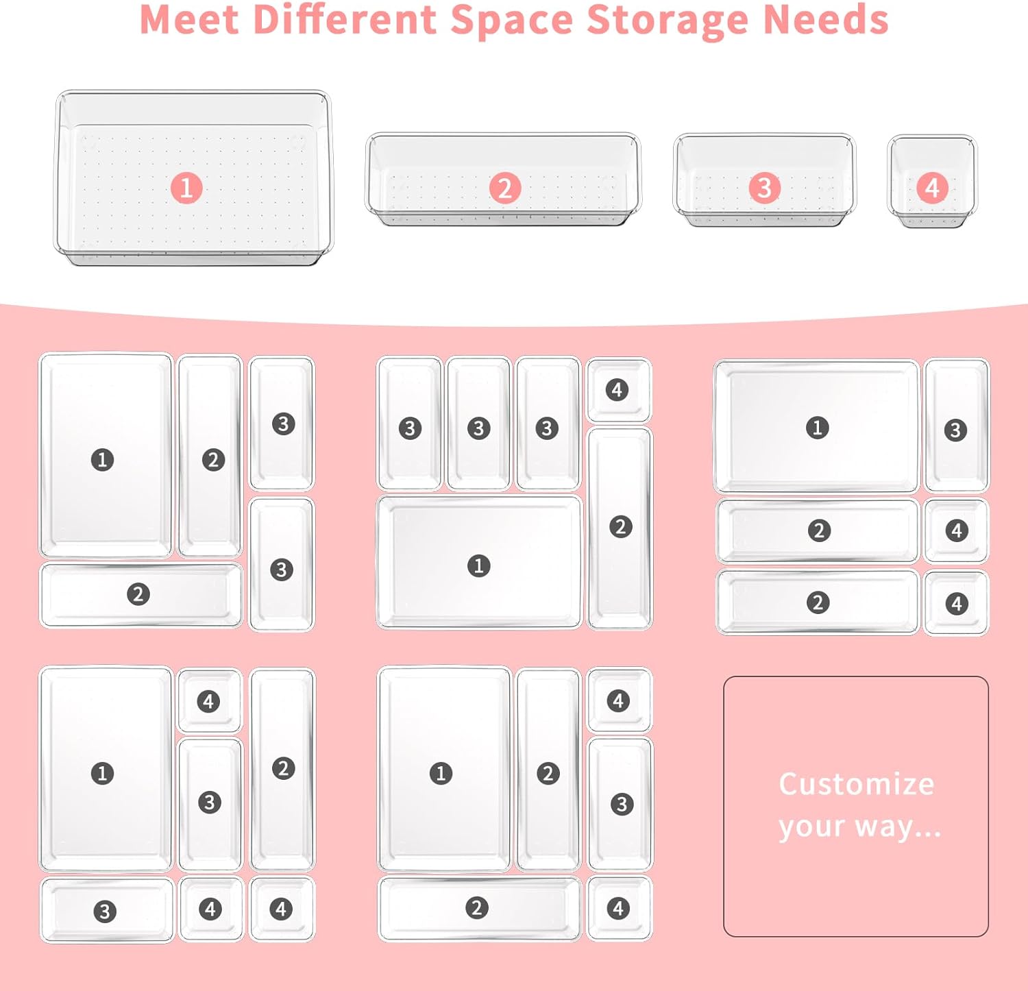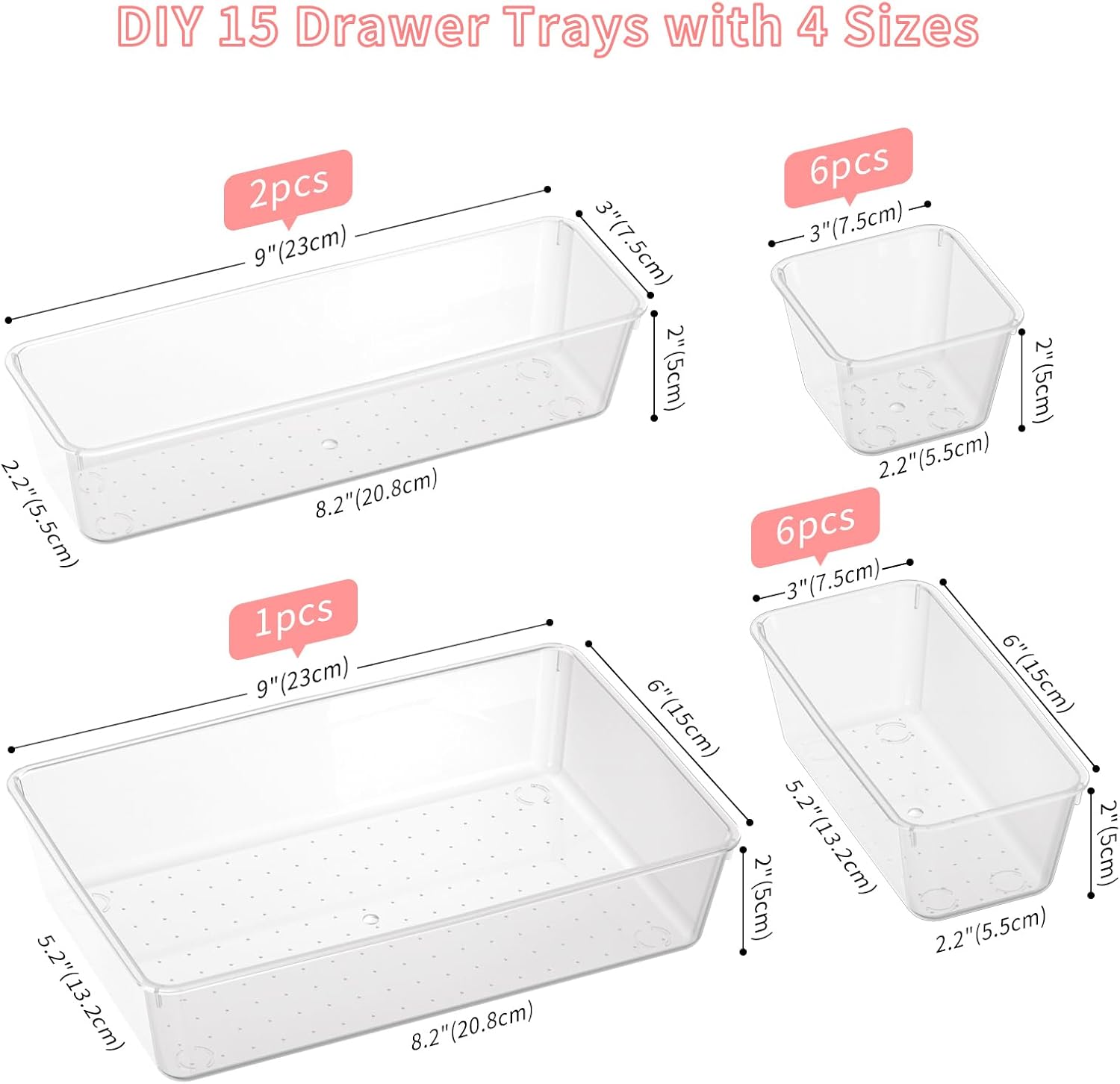15 PCS Clear Plastic Drawer Organizer Set, 4 Sizes Versatile Bathroom Drawer Organization and Storage Trays, Non-Slip Desk Vanity Storage Bins for Makeup Jewelry Kitchen Utensil Gadget Office