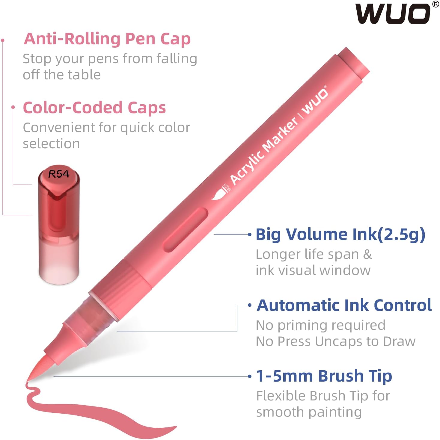 WUO 36 Colors Acrylic Paint Markers (2 Metallic), Automatic Ink Control Brush Tip for Multi-Surface Acrylic Paint Pens for Rock Painting, Wood, Canvas, Glass, DIY Art