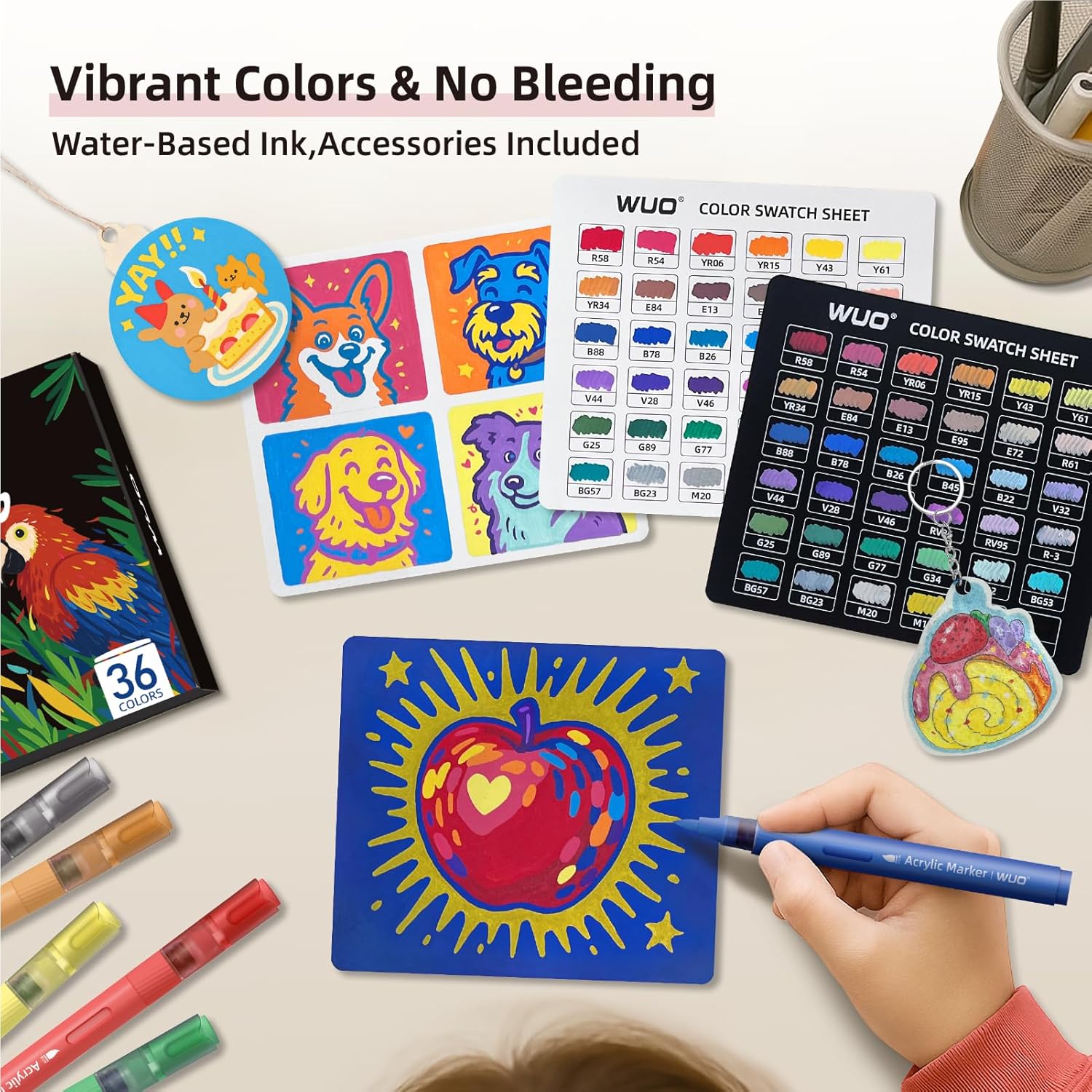 - 【36 Vibrant Colors & Complete Kit】: Features 36 highly pigmented acrylic paint markers; Includes Portable 3-layer transparent acrylic box; 1x Plastic Envelope; 1x Wood Slice for Painting; 1x Magic Foam Texture Painting kit; 2x Color Charts; 2x Pattern Paper; 1x Foam Texture Activation Tutorial and Color Blending Tutorial