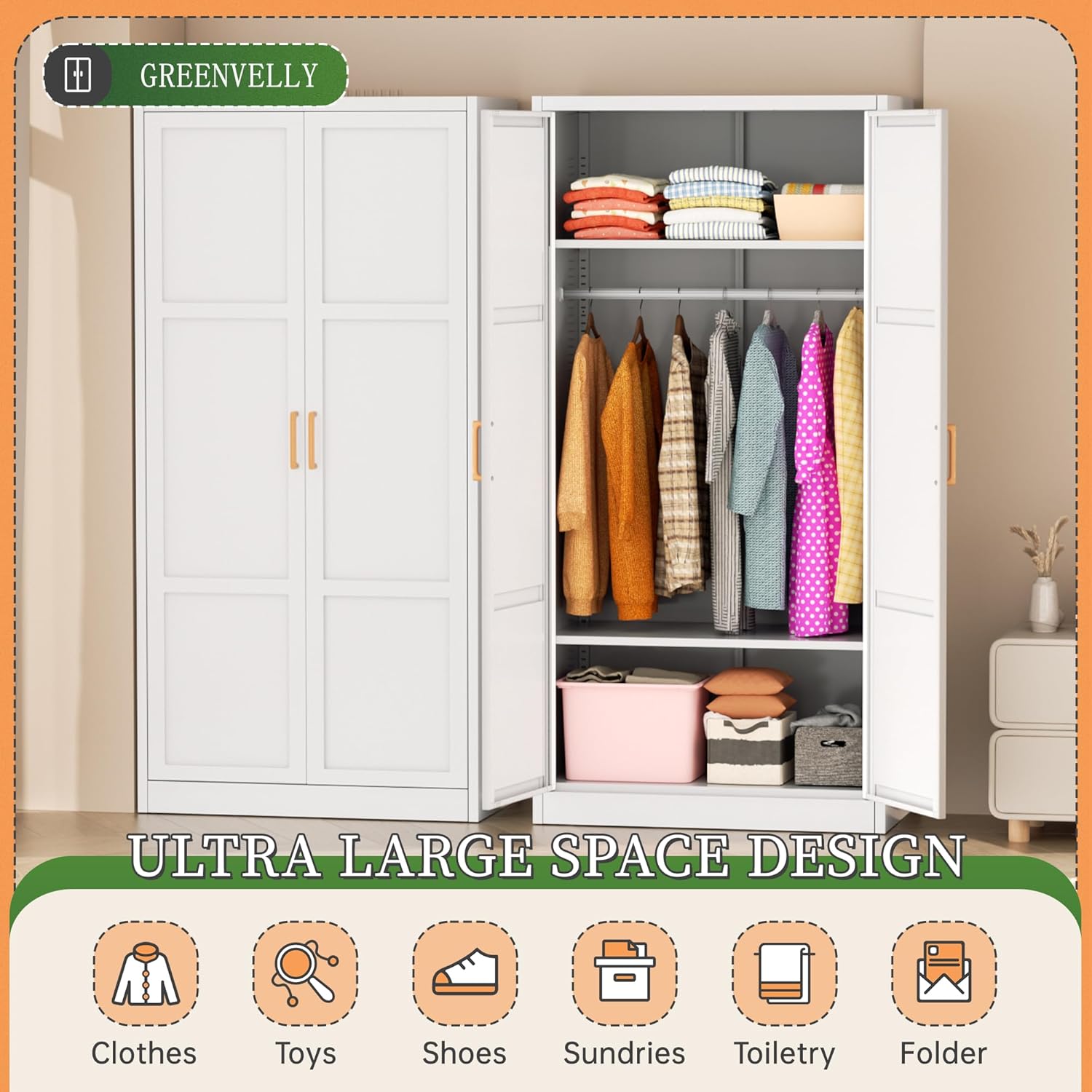 - Safe & Stable Wardrobe: Greenvelly Metal Armoire Cabinet Doors are equipped with 2 powerful magnetic closures to ensure that the doors close tightly and keep your belongings safe from dust. In addition, its well-designed anti-tipping system enables the steel wardrobe to be securely fixed to the wall, effectively preventing the possibility of accidental tipping.Metal storage cabinet can be used with confidence, especially for families with children.