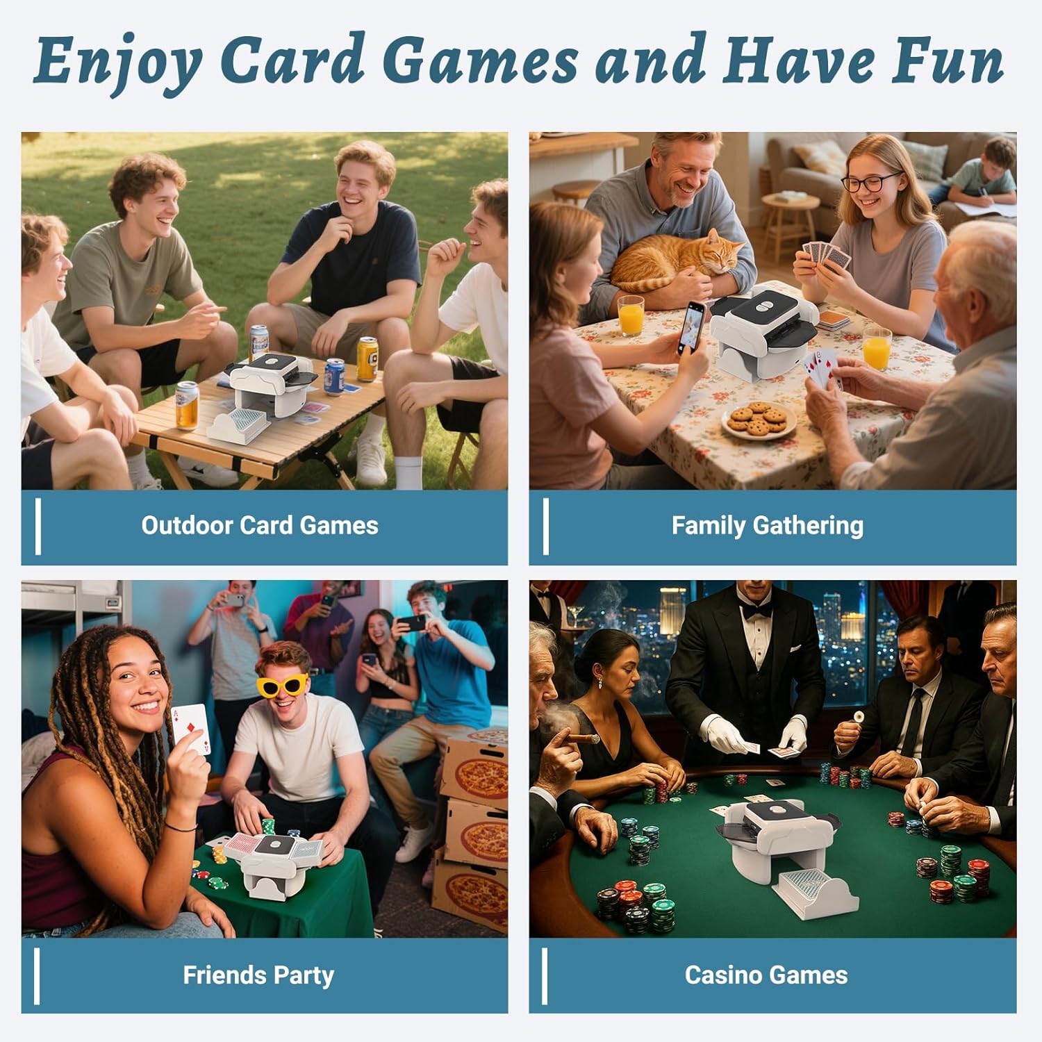 - 【Ideal Gift for Card Games Lover】This card machine is made of high-quality ABS material, durable and very suitable for casino poker, home, party, office, travel, magic trick equipment, outdoor camping and other card games. The shuffle is fast and quiet, allowing you to start your next game faster. Poker nights, family game weekends, even our kid’s birthday party. It's an ideal gift choice for all card lovers.