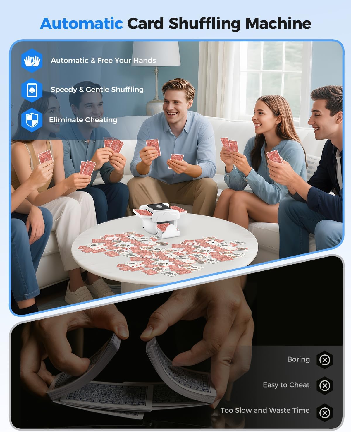 - Quiet & Durable Design: Low-noise operation won’t disturb conversations, and anti-jam technology ensures smooth shuffling every time. Compact & portable for space-saving storage