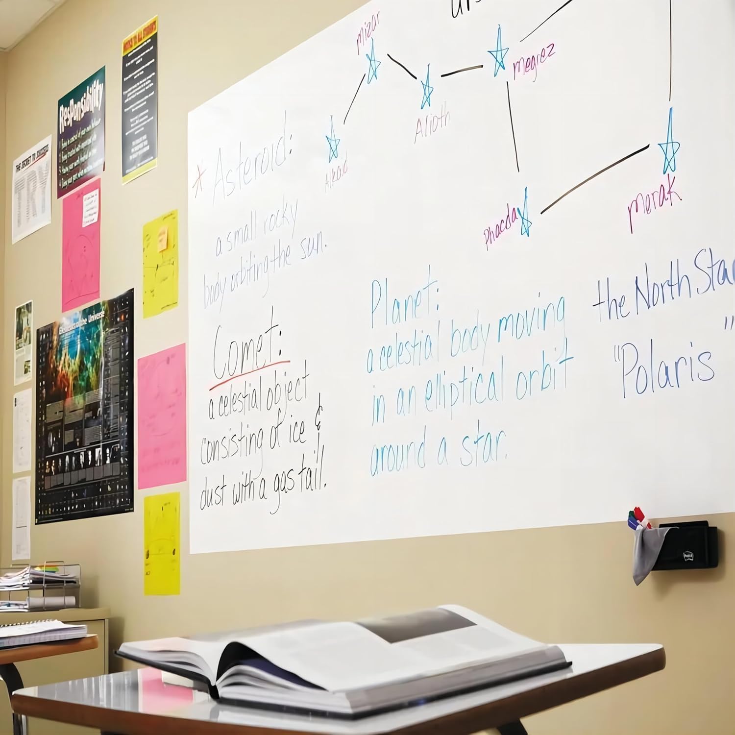 - [Easy to Apply]:With a strong adhesive backing, the whiteboard sheet can be attached to any smooth surface without drilling. Ideal as a teaching board in classrooms, a meeting tool in offices, or a refrigerator notepad at home. No chalk dust—clean and professional