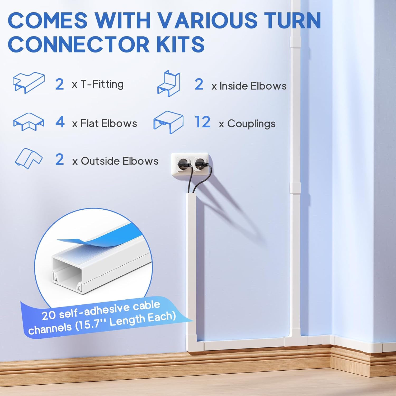 - Complete Kit Content: Each cable raceway measures 0.4" inner height × 0.59" inner width × 15.7" length, with a total coverage of 315". The set includes 20 cord hiders, 12 couplings, 4 flat-elbows, 2 T-fittings, 2 inside elbows, 2 outside elbows, and 1 instruction guide—everything you need for full cable concealment.