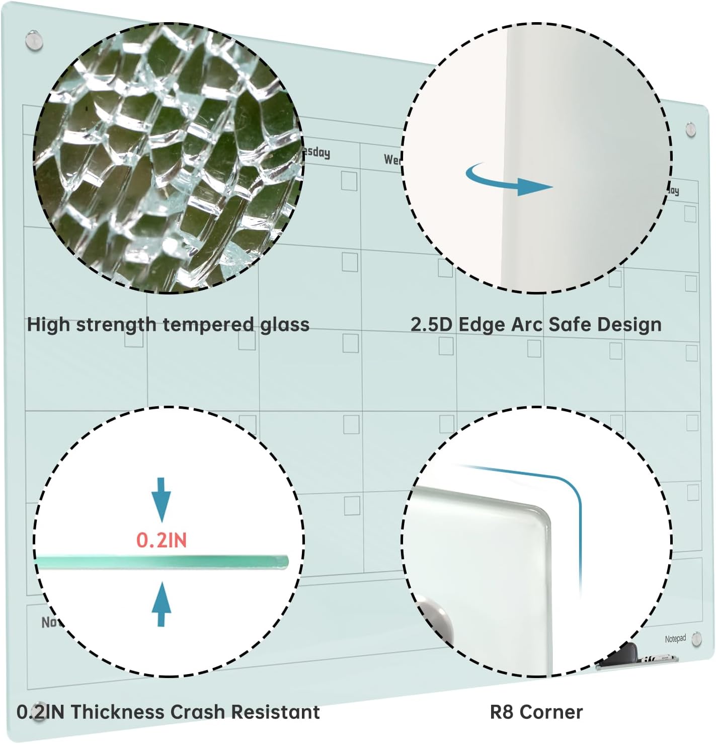Magnetic Glass Dry Erase Board Calendar- White Board 48 x 36 Inch Wall Mounted Monthly Whiteboard, Large Frameless Glass White Board for Wall Office, Home & School