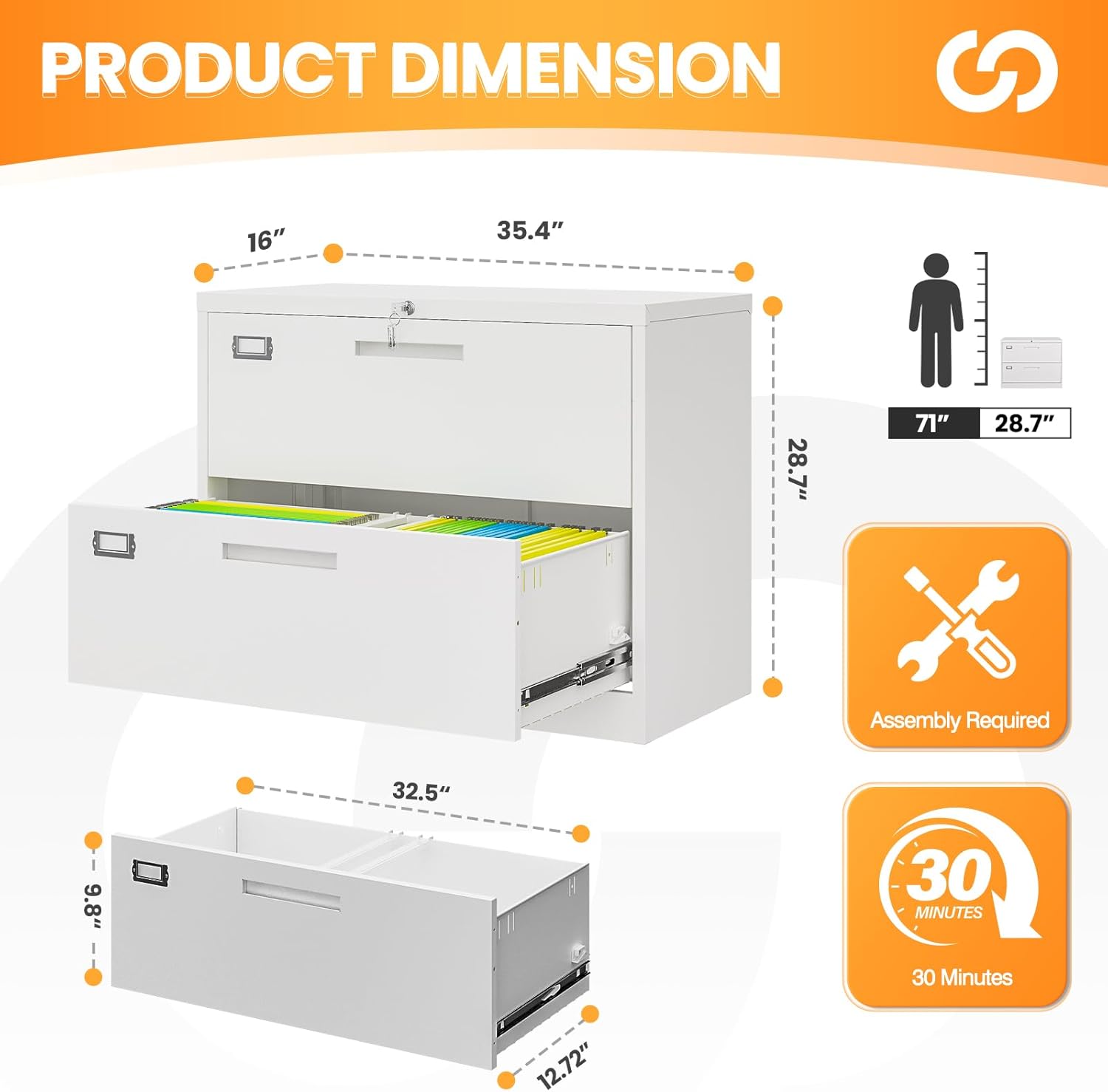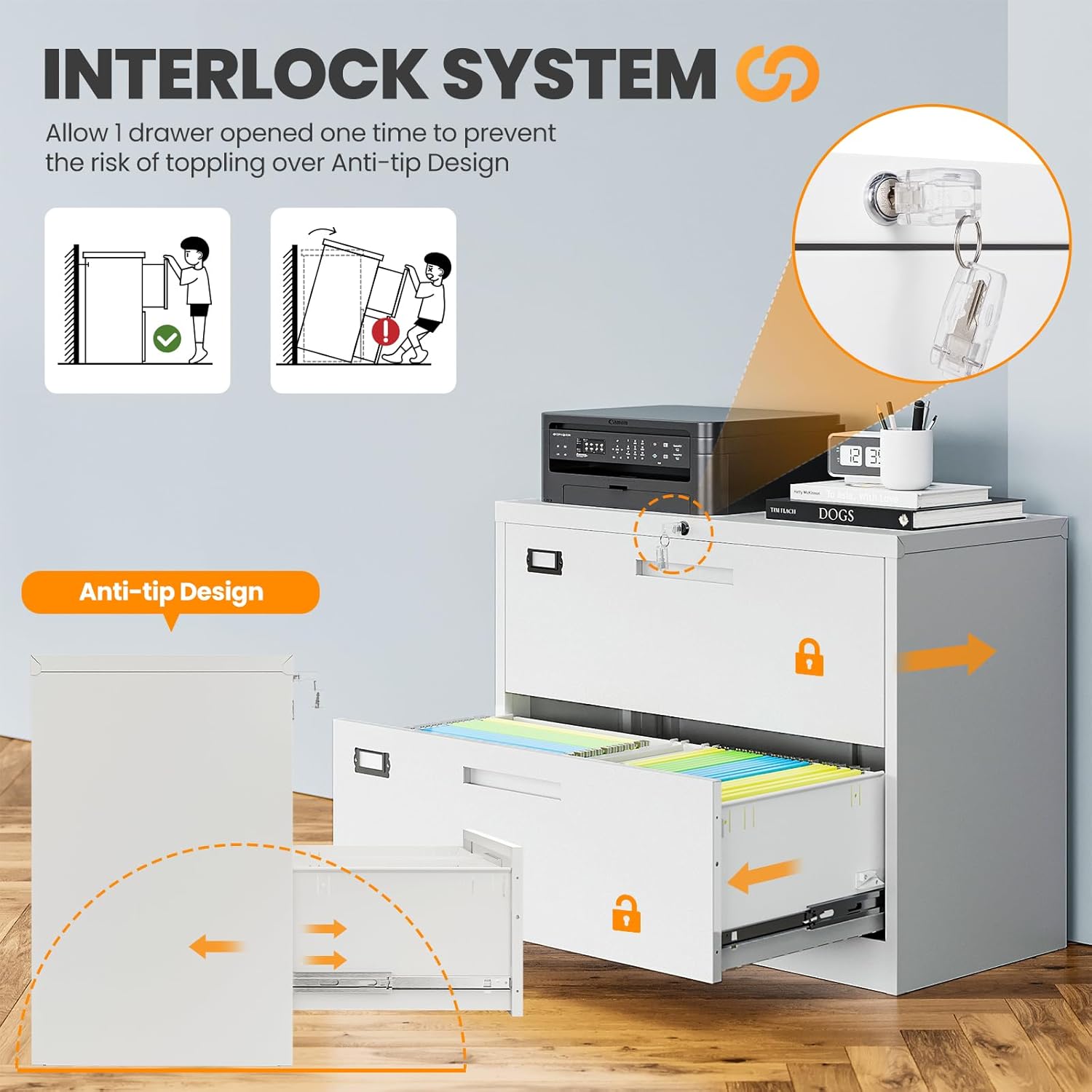 - 【Security Locking System】 ▶AFAIF horizontal file cabinet has a security and safety lock system, one lock can lock all drawers. When one of the drawers has been opened, the interlocking drawer system prevents the other drawer from opening, which prevents tipping and it come with 2 keys for your backup using. This modern lateral filing cabinet with locks, can help you keep your valuables and documents safe, such as contracts, receipts, cards, certificates, meeting materials, passports etc.