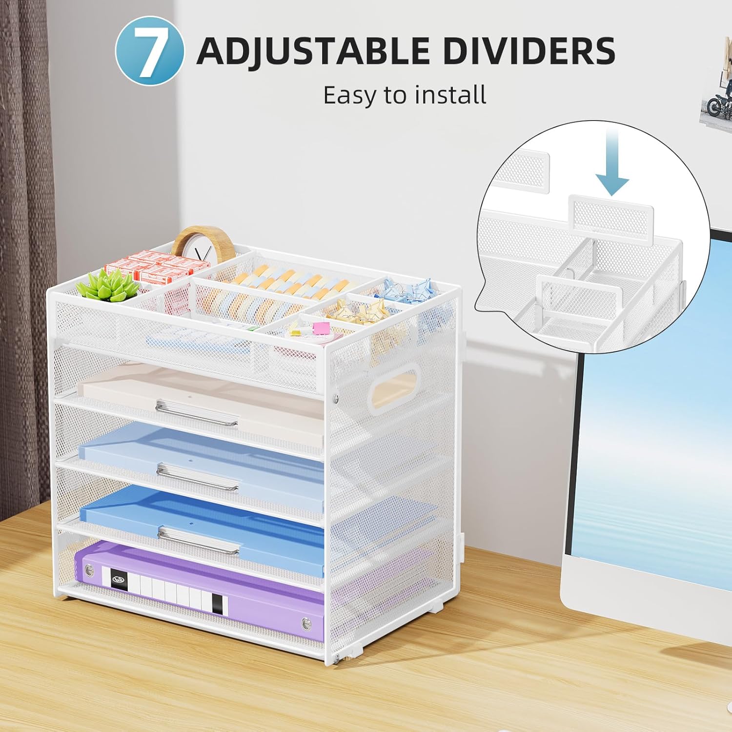Marbrasse 5-Tier Letter Tray Paper Organizer with Handle, Multi-Functional Mesh File Organizer for Desk, Adjustable Compartments Mesh Desktop Storage for Office Supplies,White