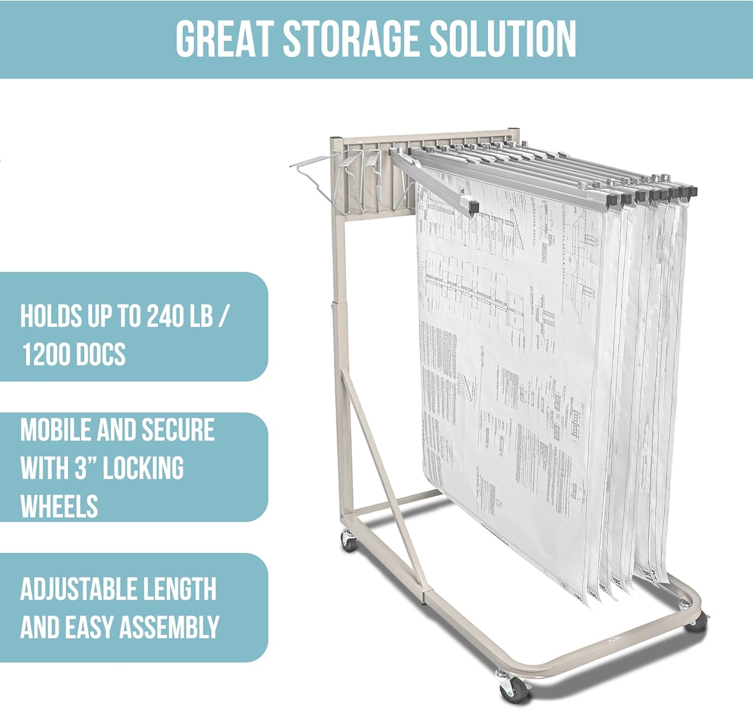 - Mobile and Adjustable Rack: The blueprint rack rolls smoothly on four casters, with front brakes for stability. Height and depth adjustments accommodate different file sizes, making it versatile for various office or job site needs.