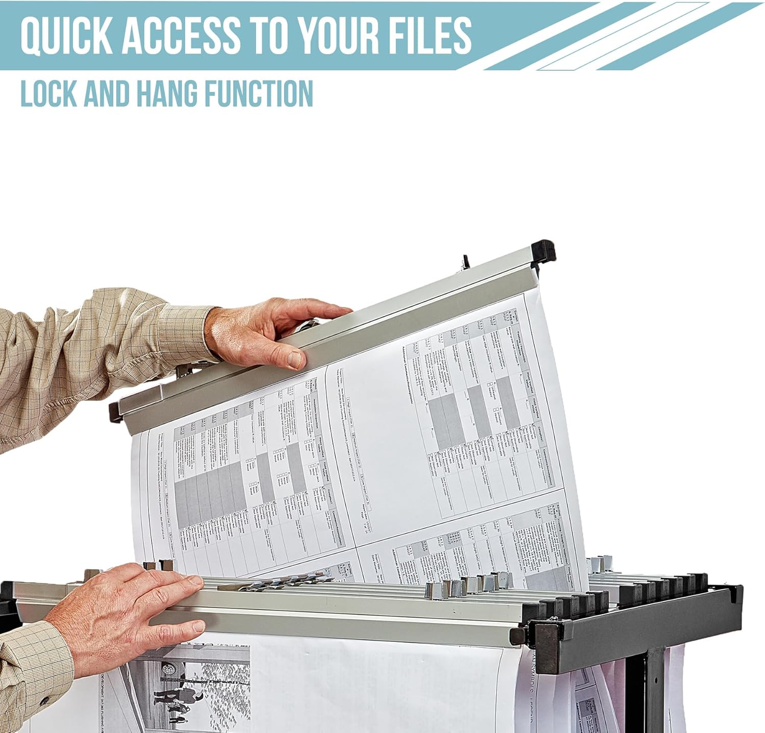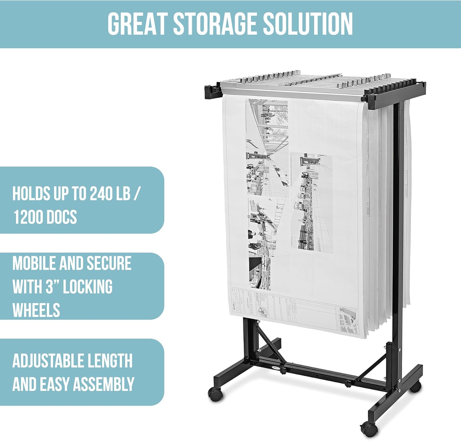 • Mobile and Adjustable Rack: The blueprint rack rolls smoothly on four casters, with front brakes for stability. Height and depth adjustments accommodate different file sizes, making it versatile for various office or job site needs.