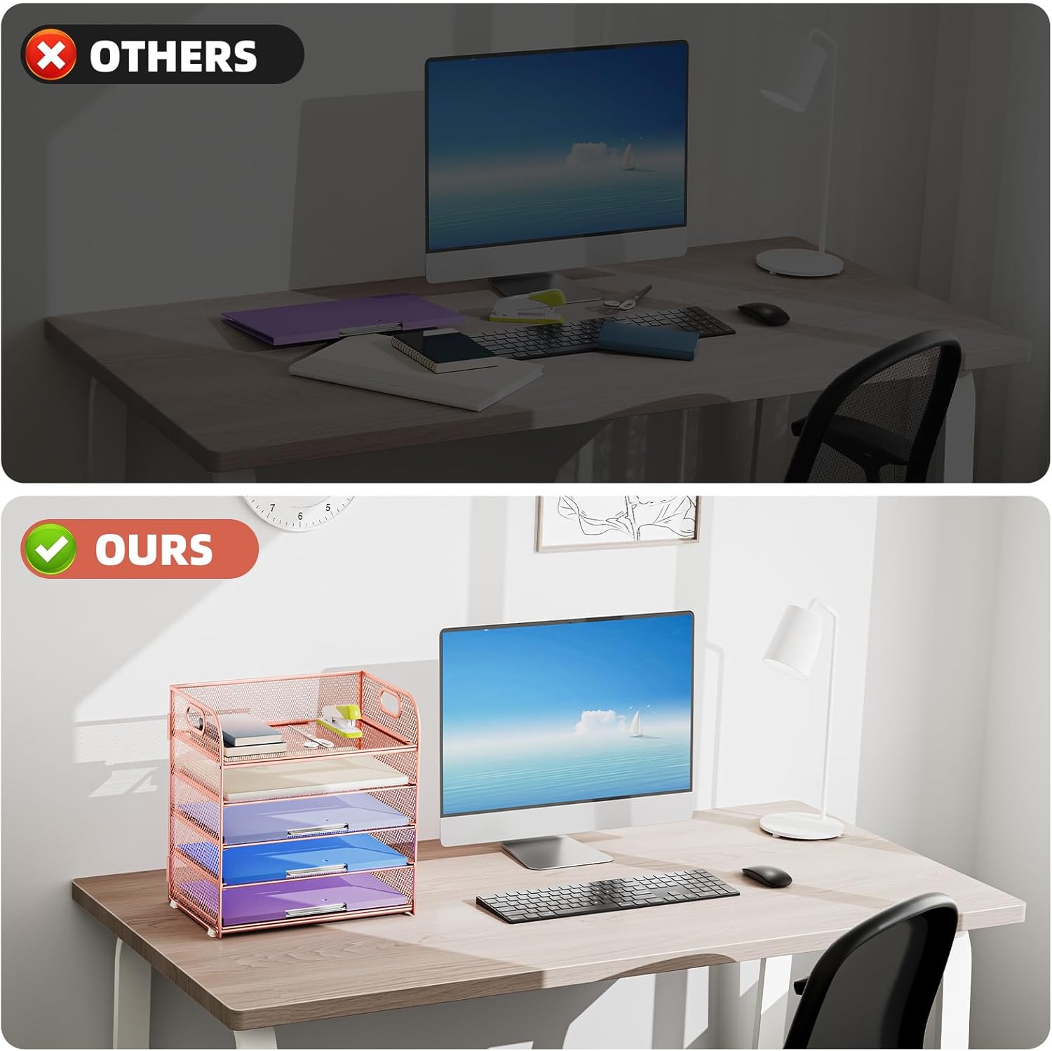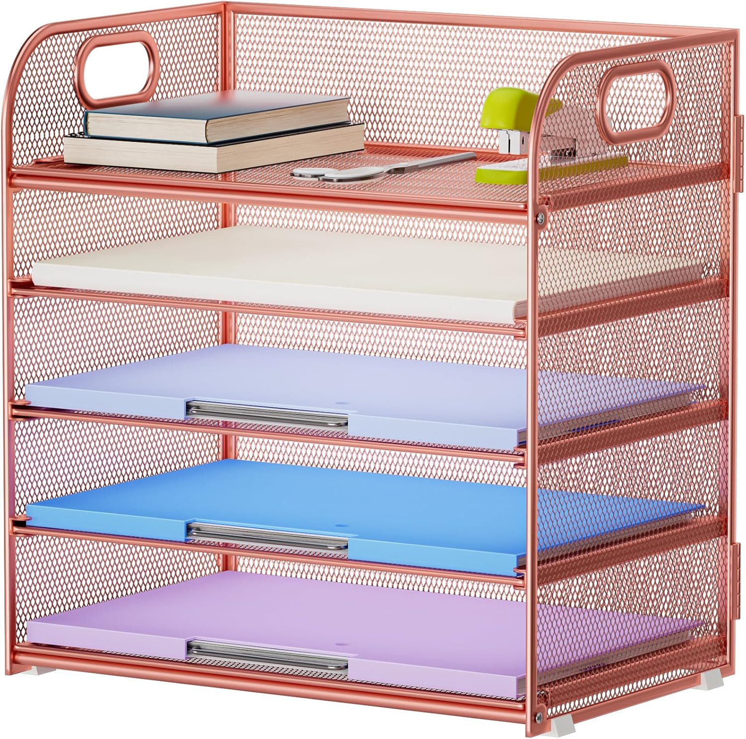 Marbrasse 5 Tier Paper Organizer Letter Tray, Mesh Desk File Organizer with Handle, Paper Sorter Desk Organizer for Home Office Supplies - Rose Gold