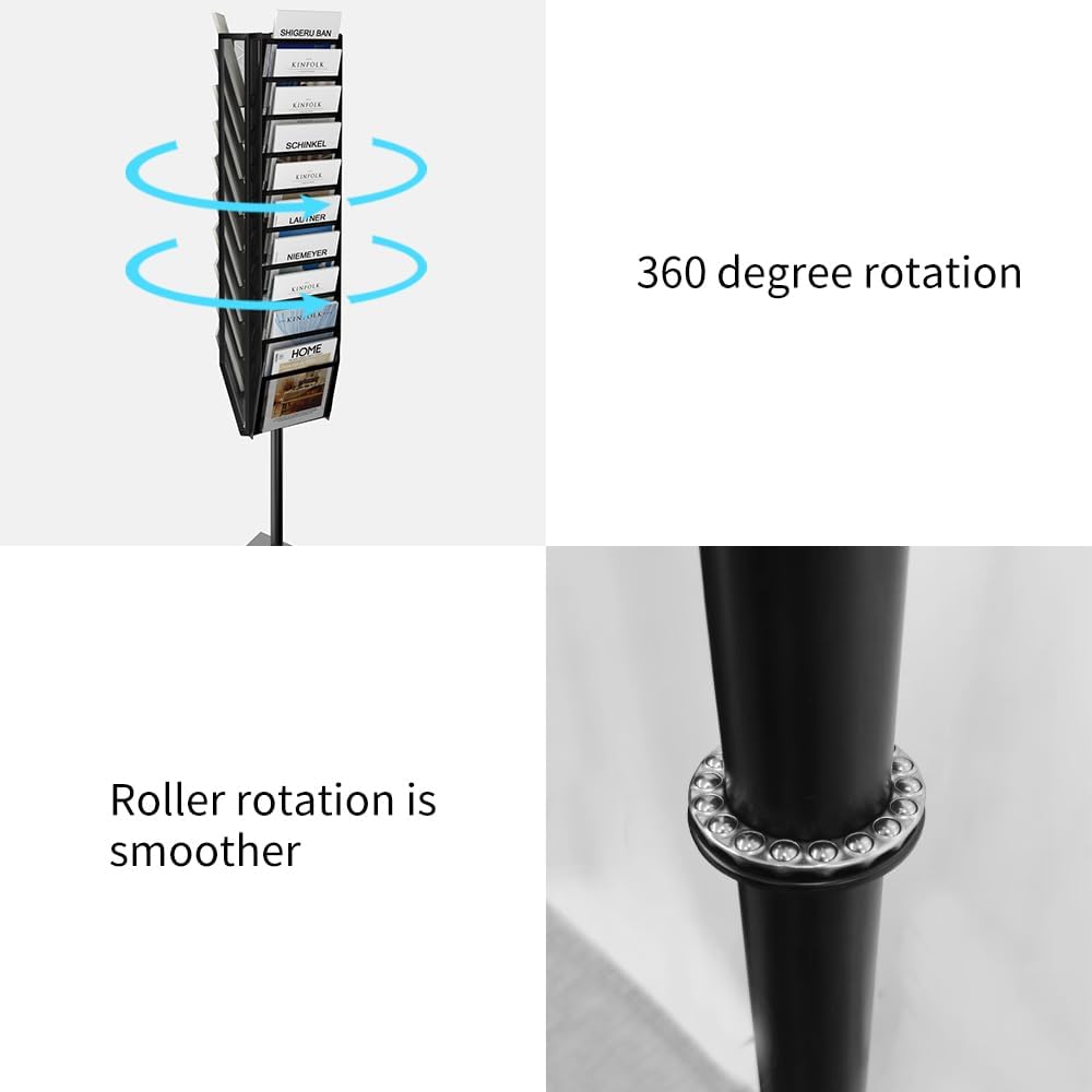 - 360°ROTATION:This magazine holder adopts a roller design that can rotate 360 °. Thanks to the roller design, the rotation is more effortless and does not cause any wear to the magazine rack. It can meet the needs of visitors from three sides to read magazines at the same time