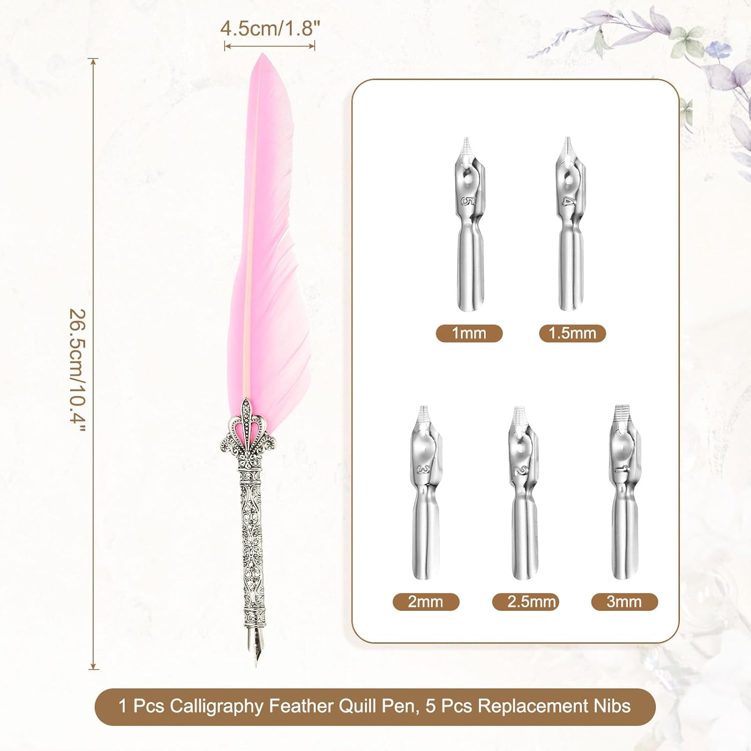 - Specifications: Color: Pink; Material: Metal, Feather; Pen length: 26.5 x 4.5cm / 10.4 x 1.8inch ( L * W ); Pen Diameter: 0.8cm / 0.3inch; Packing List: 1 x Calligraphy Feather Quill Pen, 5 x Replacement Nibs