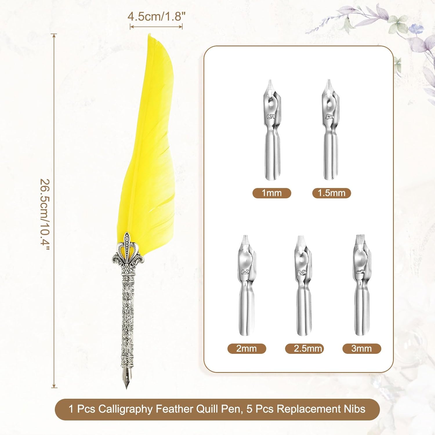 - Specifications: Color: Light Yellow; Material: Metal, Feather; Pen length: 26.5 x 4.5cm / 10.4 x 1.8inch ( L * W ); Pen Diameter: 0.8cm / 0.3inch; Packing List: 1 x Calligraphy Feather Quill Pen, 5 x Replacement Nibs