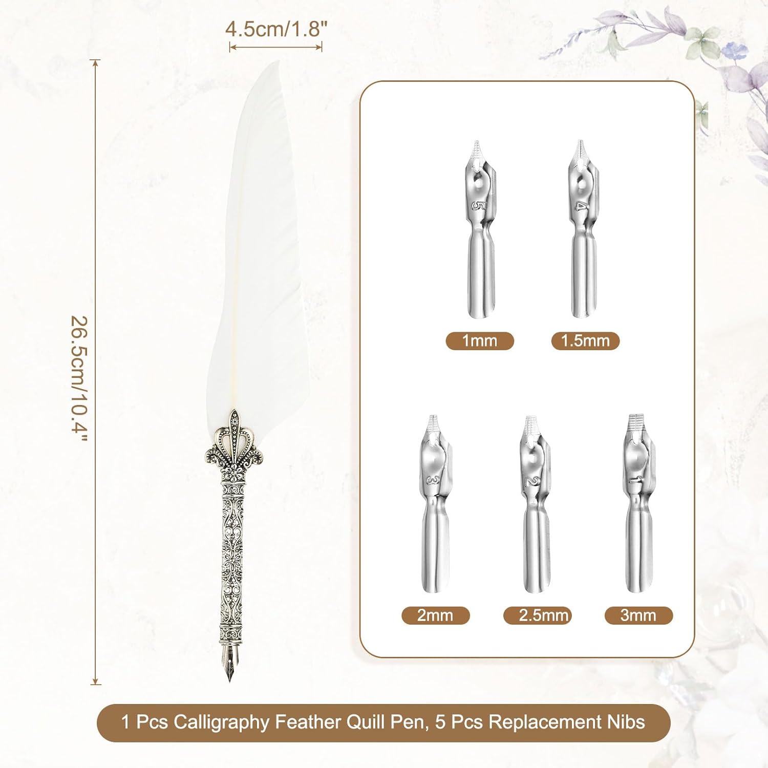 - Specifications: Color: White; Material: Metal, Feather; Pen length: 26.5 x 4.5cm / 10.4 x 1.8inch ( L * W ); Pen Diameter: 0.8cm / 0.3inch; Packing List: 1 x Calligraphy Feather Quill Pen, 5 x Replacement Nibs