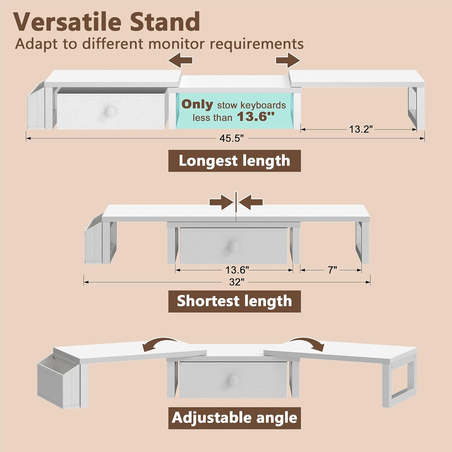 - [Smart and Adjustable] Our computer monitor stand adopts a telescopic design and can be adjusted from 32 inches to 45.5 inches. It can easily match whether it is a compact desk or a spacious workbench. With the multi-angle rotation function, you can always maintain the best viewing angle and effectively improve your work efficiency