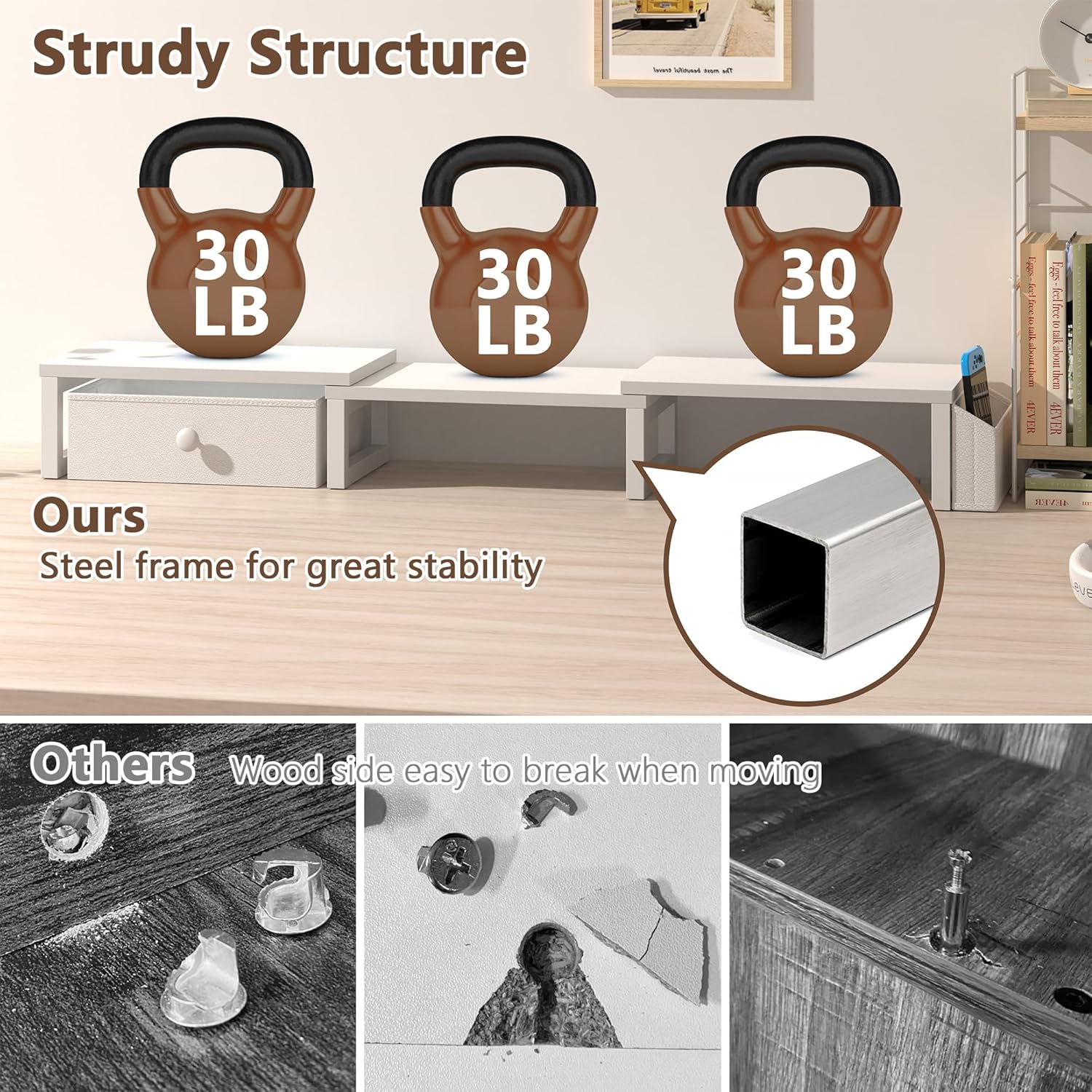- [Intimate Side Pockets and Drawers] We have specially designed a side pocket and a drawer for this monitor stand riser, you can freely choose to install it on the left or right side of the monitor stand according to your needs to increase storage diversity (in order to have a better user experience, it is not recommended that you place the drawer in the middle of the desktop stand)