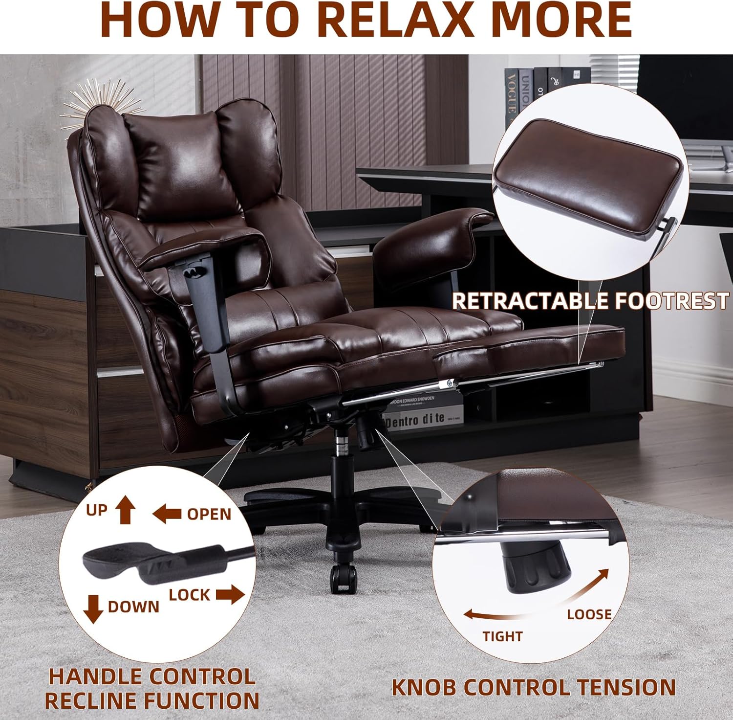 - πΊπππππ: Leather office chair built on a foundation of durability. Heavy-duty metal base and SGS-certified 4-Grade lift cylinder ensure not only steadfast executive chair with leg rest stability but also peace of mind with big and tall office chair every adjustment.