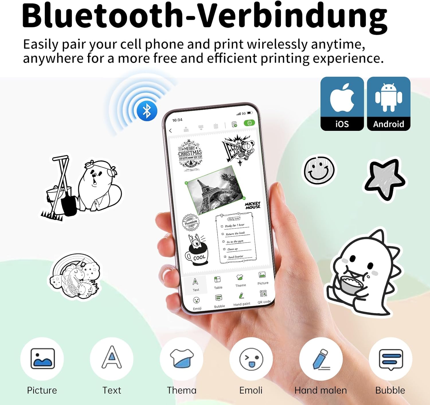 - Small & Compact Design: Our portable mini printer is a compact stickers makers, with bluetooth printer for iPhone and Android compatibility, perfect for student, professional, and DIY lover. Easily carry this sticker printer in your bag or pocket to print study notes, label, or to-do list anytime, anywhere