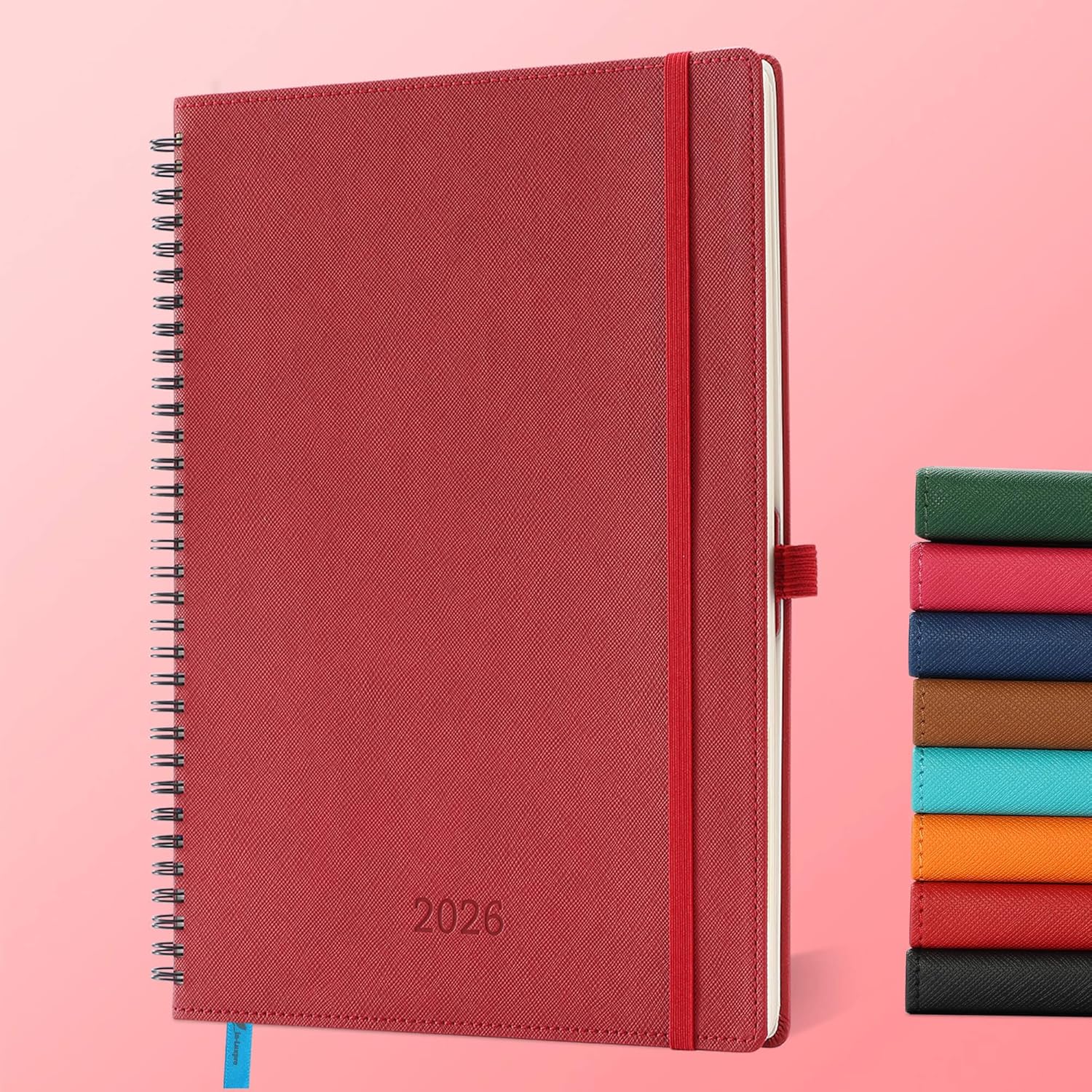 Planner 2026 Daily Weekly and Monthly,11.5"x8.5",12 Months Spiral Bound Calendar Agenda with Self-adhesive Pen Holder,2026 Appointment Book with Vegan Leather Soft Cover,Red