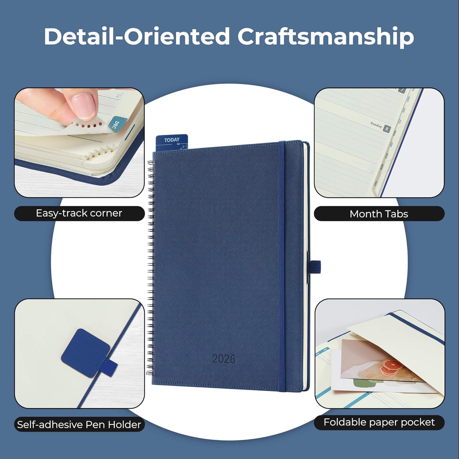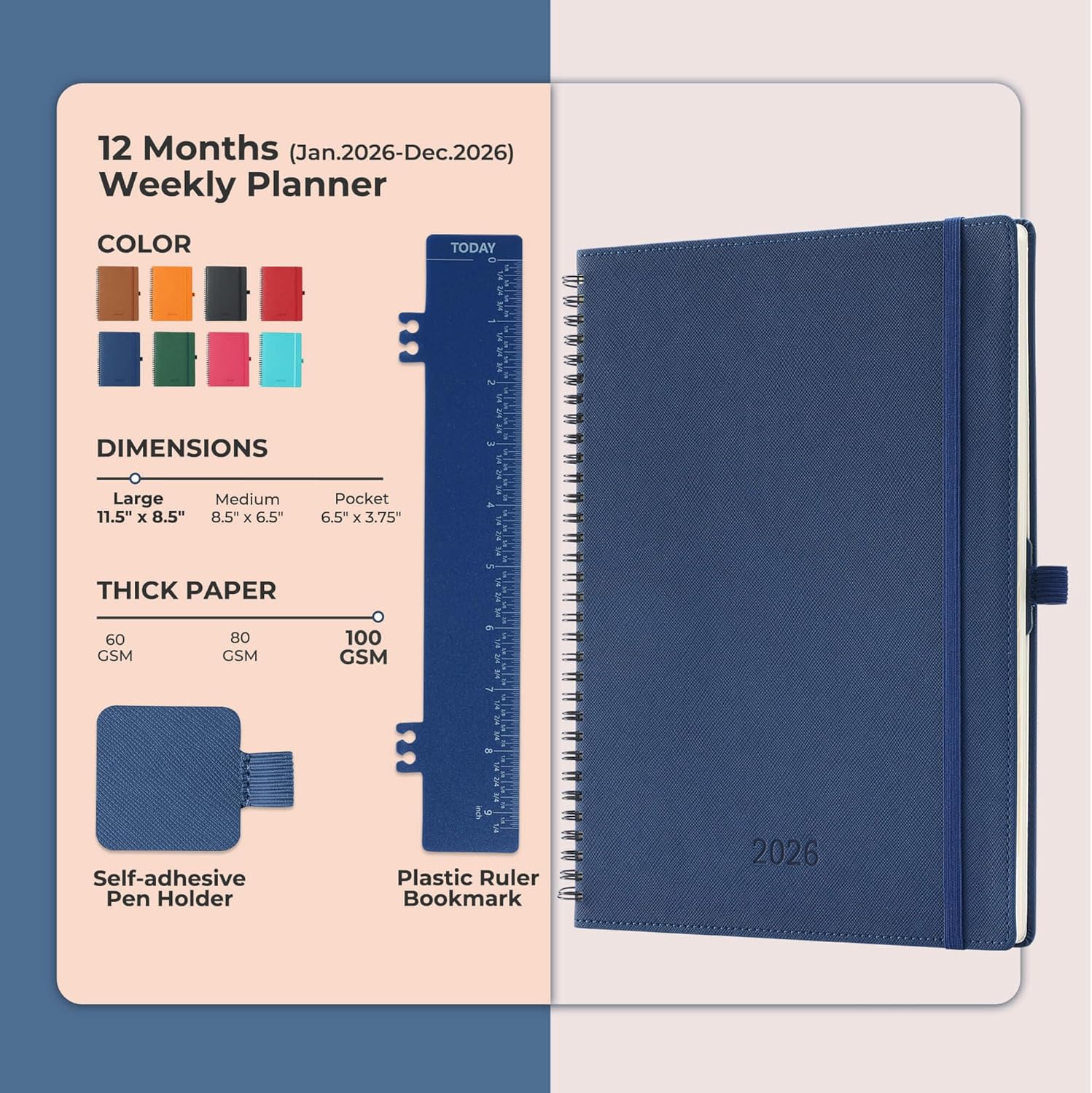 Planner 2026 Daily Weekly and Monthly,11.5"x8.5",12 Months Spiral Bound Calendar Agenda with Self-adhesive Pen Holder,2026 Appointment Book with Vegan Leather Soft Cover,Blue