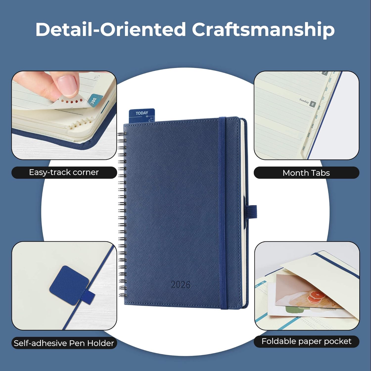 Planner 2026 Daily Weekly and Monthly,8.5"x6.5",12 Months Spiral Bound Calendar Agenda with Self-adhesive Pen Holder,2026 Appointment Book with Vegan Leather Soft Cover,Blue